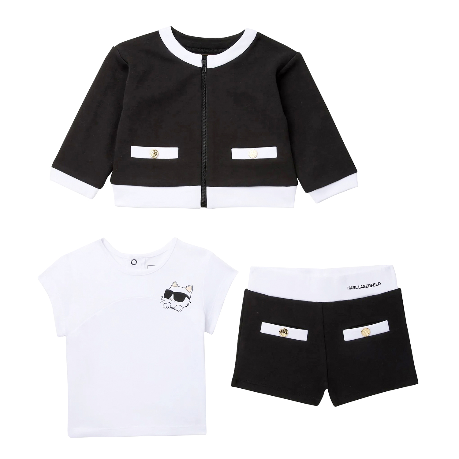 Karl Lagerfeld τριπλό σετ σε μαύρο χρώμα από εξαιρετικά απαλό και ελαστικό οργανικό βαμβάκι. Διαθέτει ζακέτα με φιγούρα Choupette, ασορτί σορτς με ψεύτικα χρυσά κουμπιά και λευκό μπλουζάκι με τη φιγούρα Choupette με κουμπάκι στον ώμο (στα μικρότερα μεγέθη).