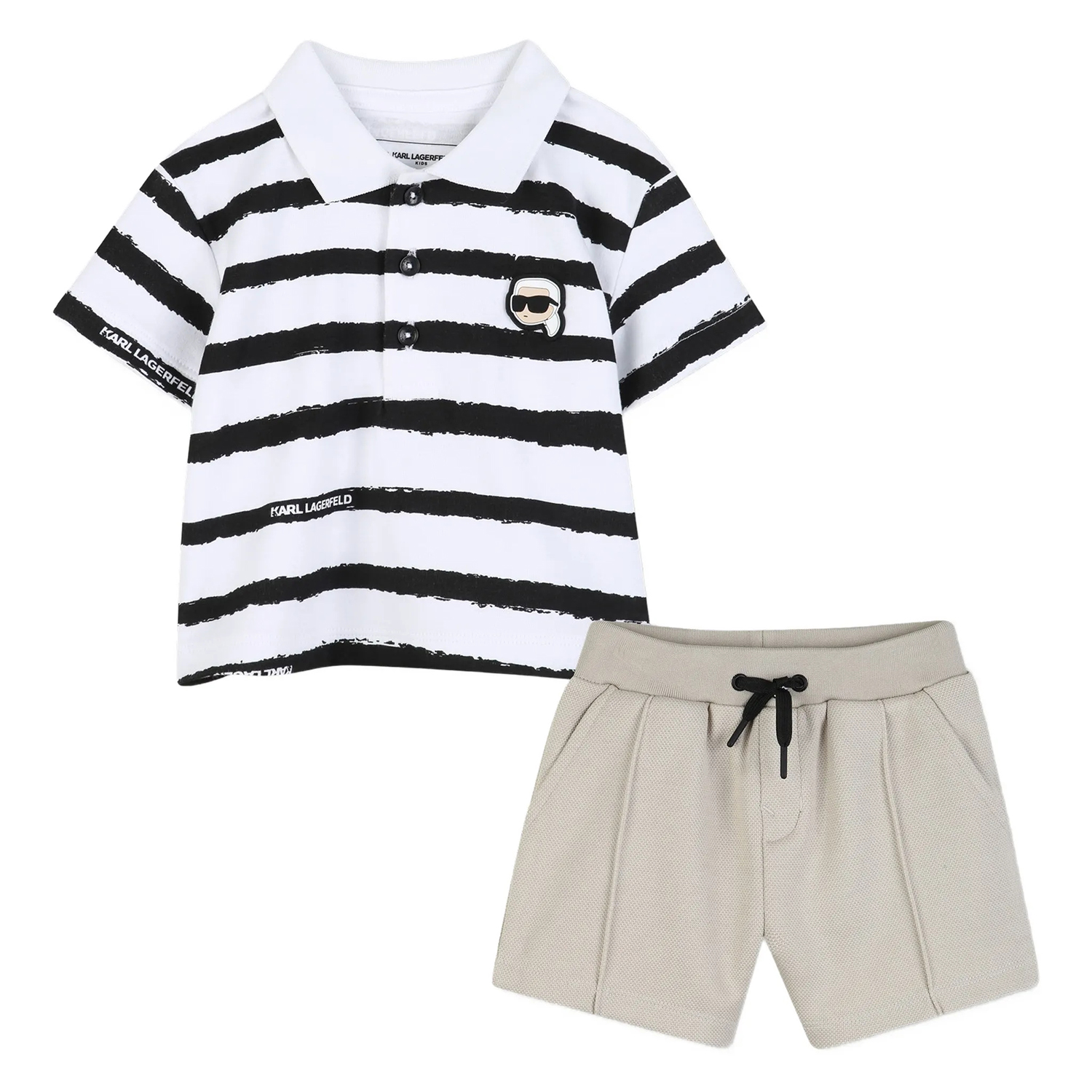 Karl Lagerfeld σετ-κουτί δώρου σε λευκό-μπεζ από οργανικό βαμβάκι. Διαθέτει λευκό-ριγέ μπλουζάκι πόλο με φιγούρα Karl και μπεζ πικέ ελαστικό σορτς.