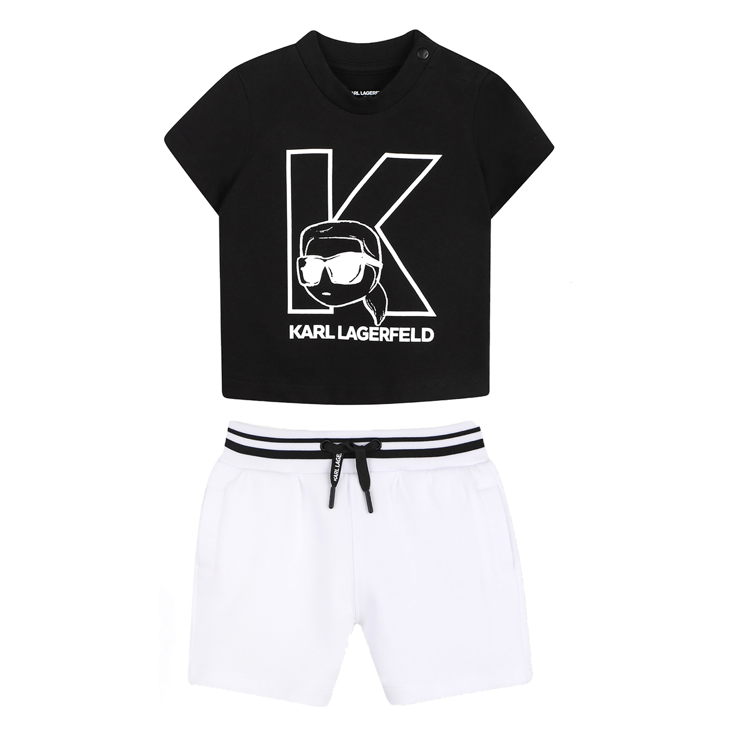Karl Lagerfeld λευκό-μαύρο σετ από οργανικό βαμβάκι. Διαθέτει μαύρο μπλουζάκι με φιγούρα Karl και λευκό σορτς με ριγέ ελαστική μέση.