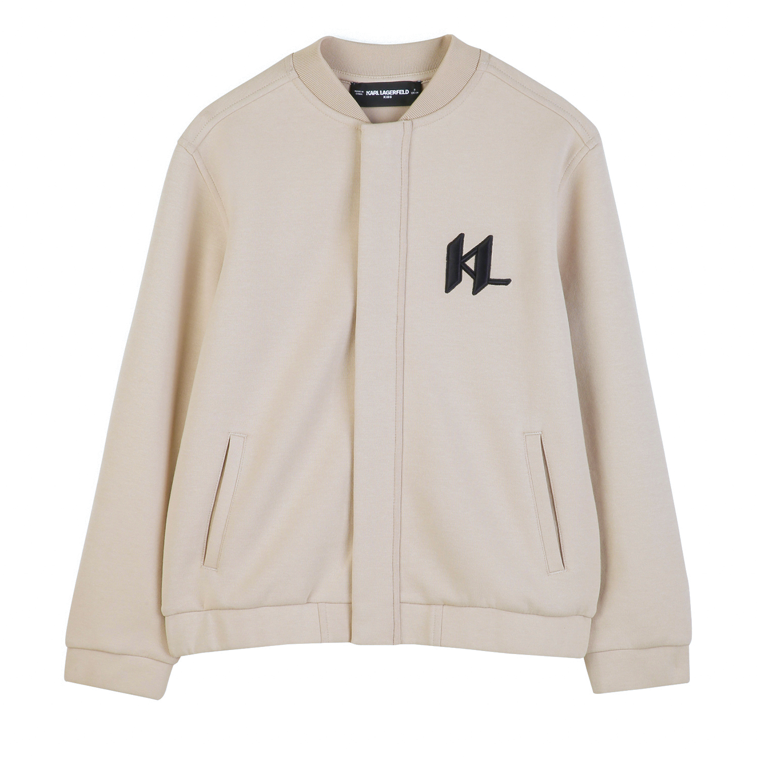 Karl Lagerfeld μπεζ άνετη και ελαστική ζακέτα φούτερ, με καλυμμένο φερμουάρ, μαύρο κεντημένο λογότυπο μπροστά και πίσω και γιακά σε στυλ μπέιζμπολ.