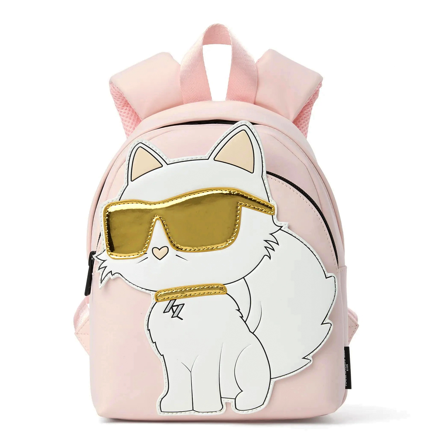 Karl Lagerfeld μικρό σακίδιο πλάτης σε ανοιχτό ροζ χρώμα με φιγούρα Choupette μπροστά, κλείσιμο με φερμουάρ και μαλακά εργονομικά λουράκια πλάτης και ώμου.