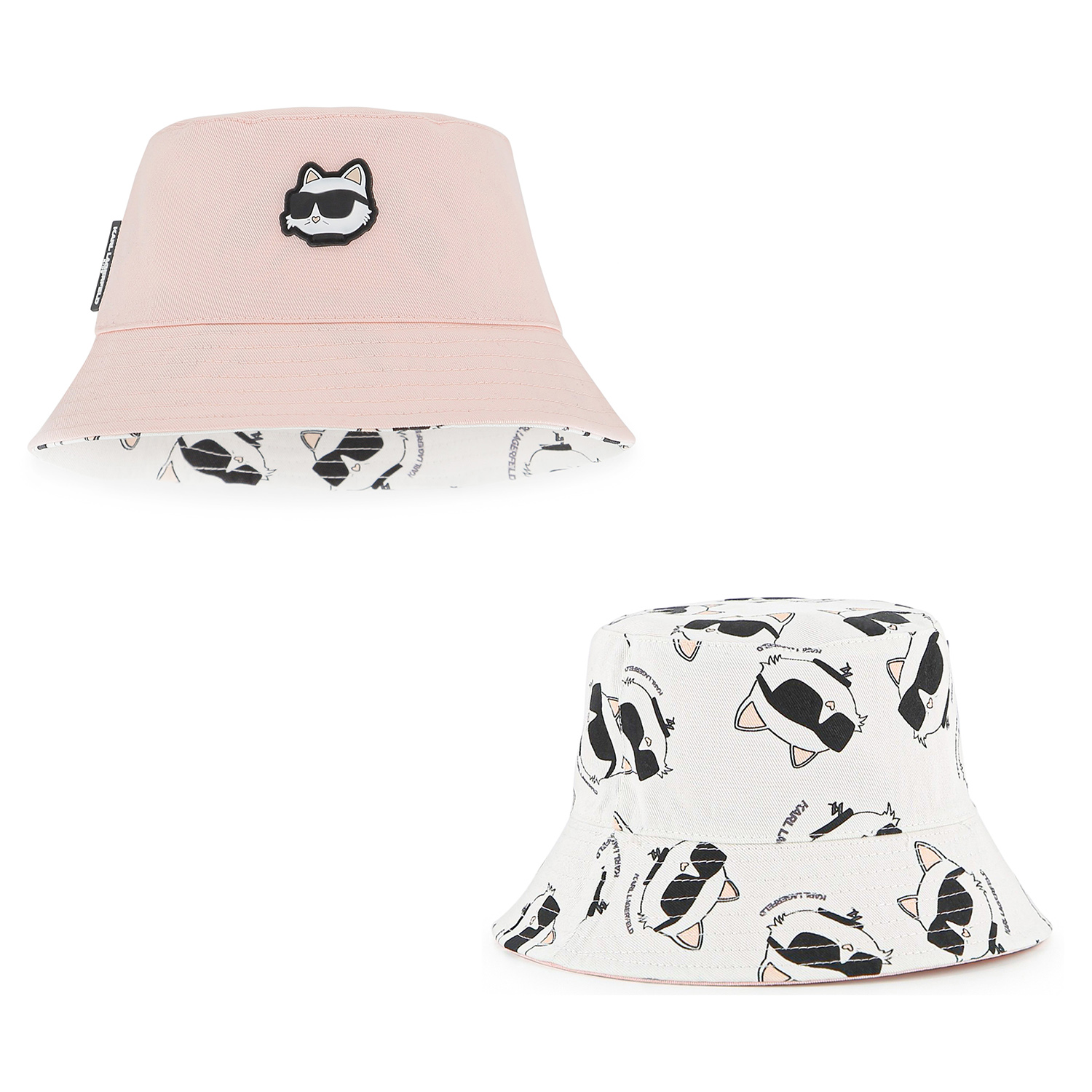 Karl Lagerfeld ροζ παλ-λευκό βαμβακερό καπέλο τύπου bucket διπλής όψης, με εκτυπώσεις και φιγούρες Choupette.