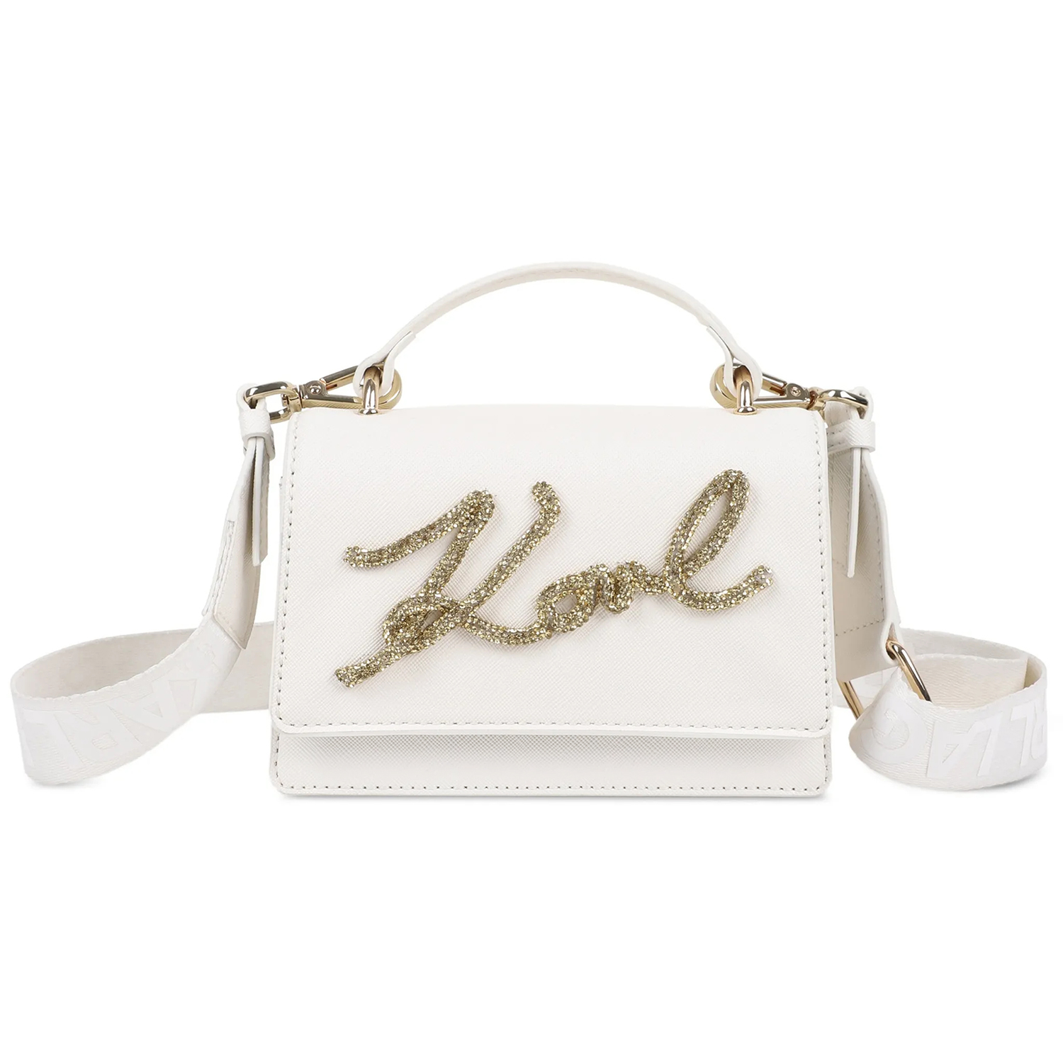 Karl Lagerfeld υπόλευκη τσάντα ώμου από οικολογικό δέρμα, με ένα στρασένιο λογότυπο, μαγνητικό κούμπωμα και ασορτί λουράκι ώμου με λογότυπο.