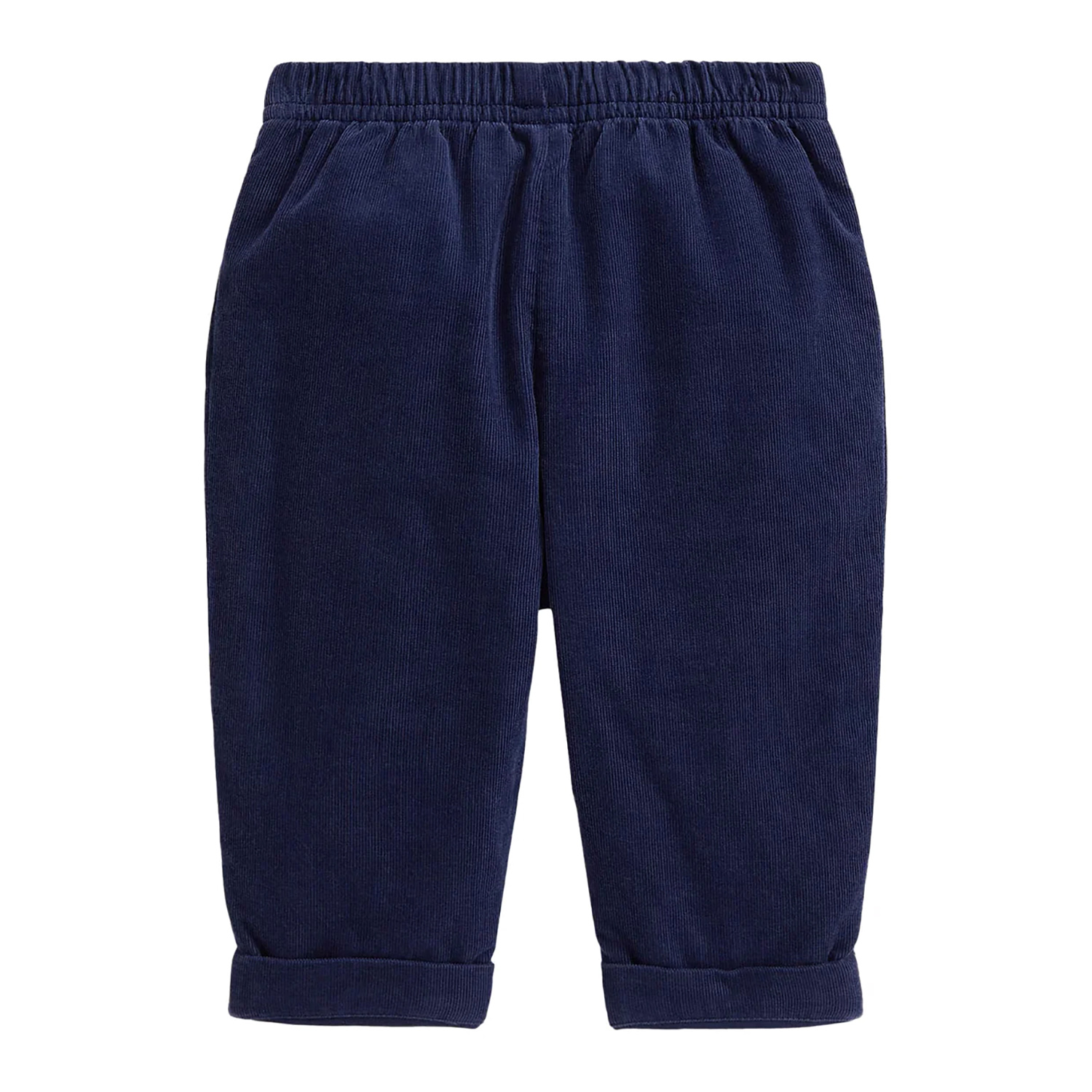 Polo Ralph Lauren blue cotton corduroy trousers with an elasticated waist and and sewn leg hem.