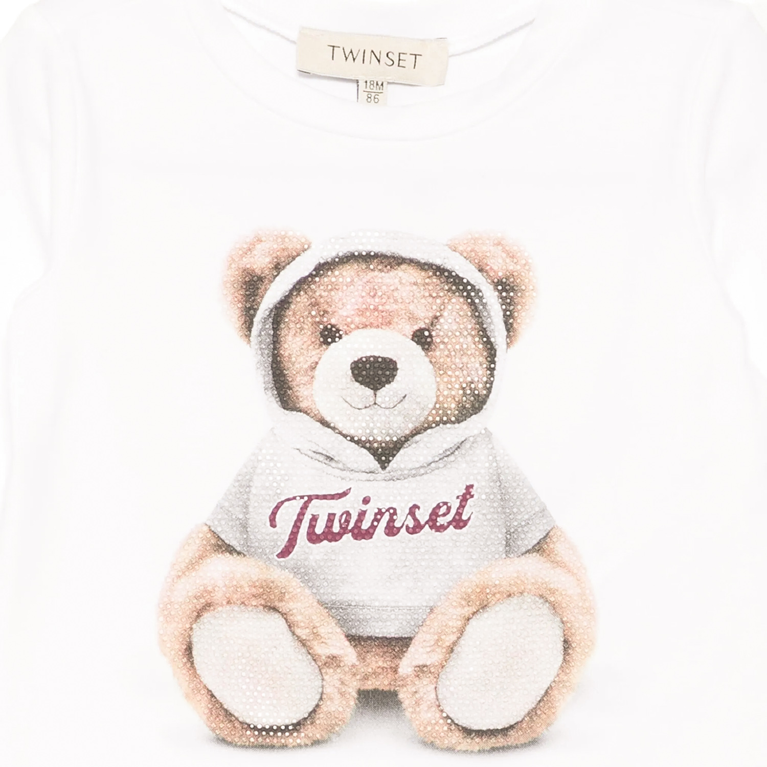 Twinset off-white cotton t-shirt featuring a teddy printed in front with rhinestone applications.