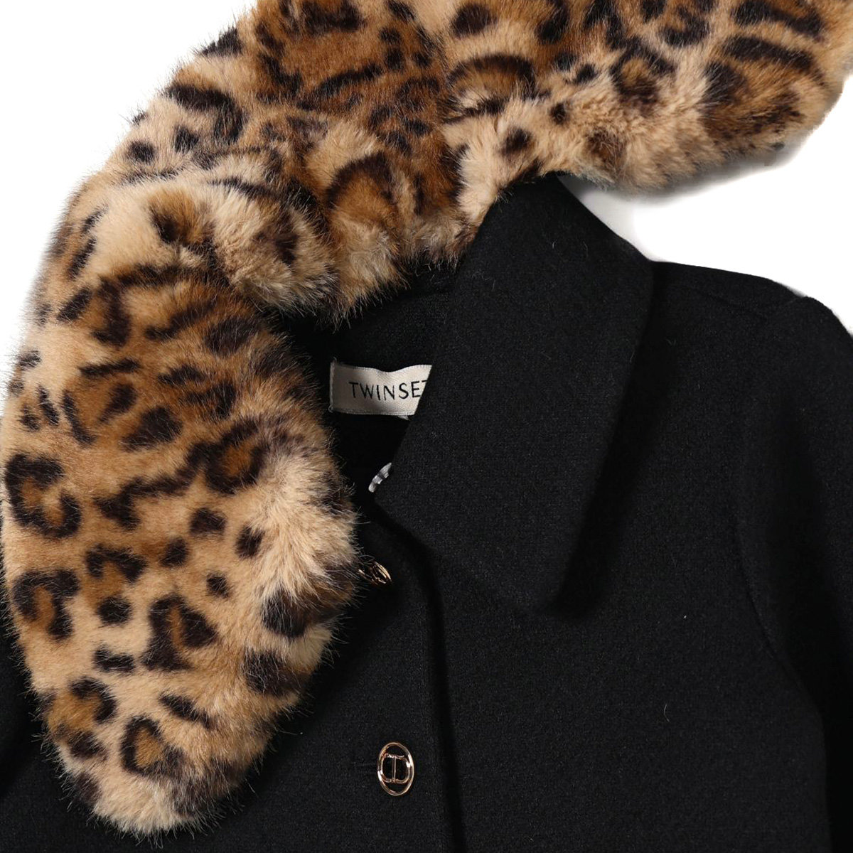Twinset black coat with an eco-fur removable animal printed collar. It features gold-tone logo button fastening and soft lining.
