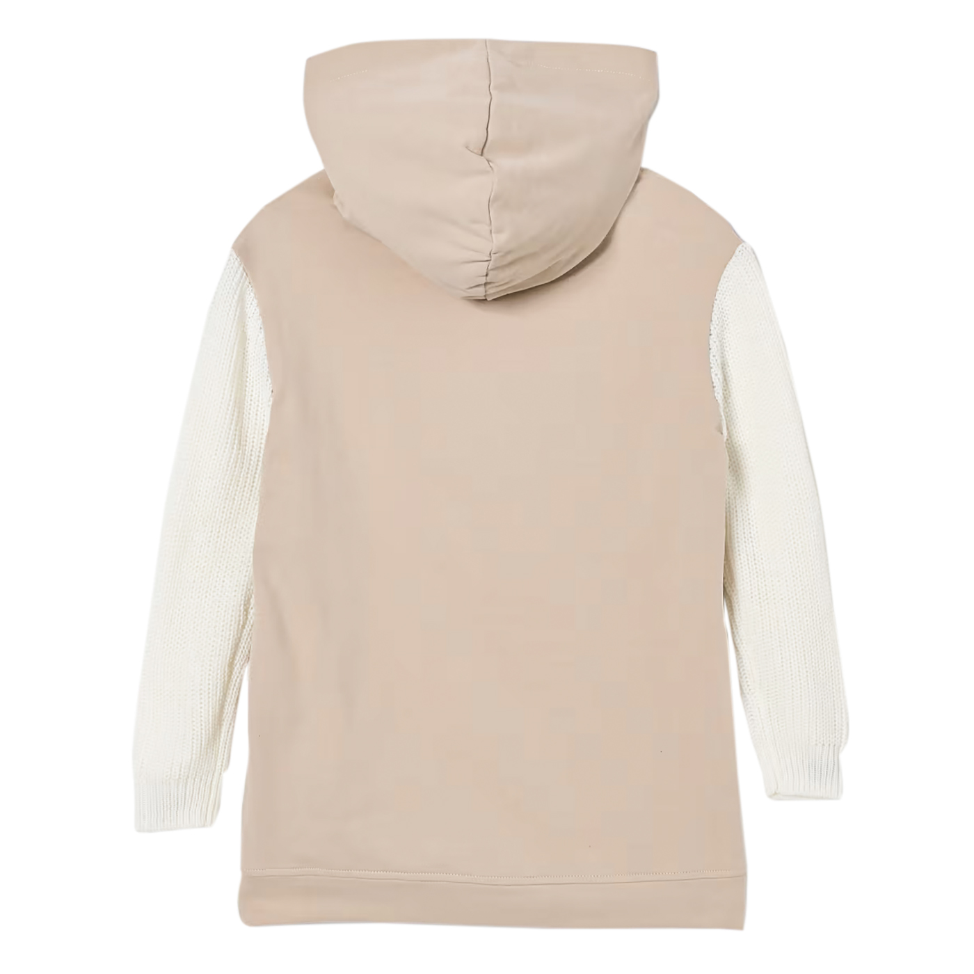 Twinset light beige cotton sweat dress with hood and knitted sleeves. It features front logo and rhinestone logo applications.