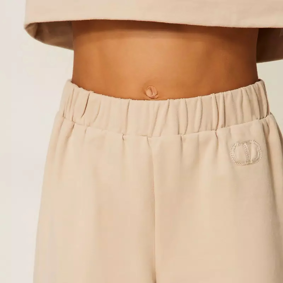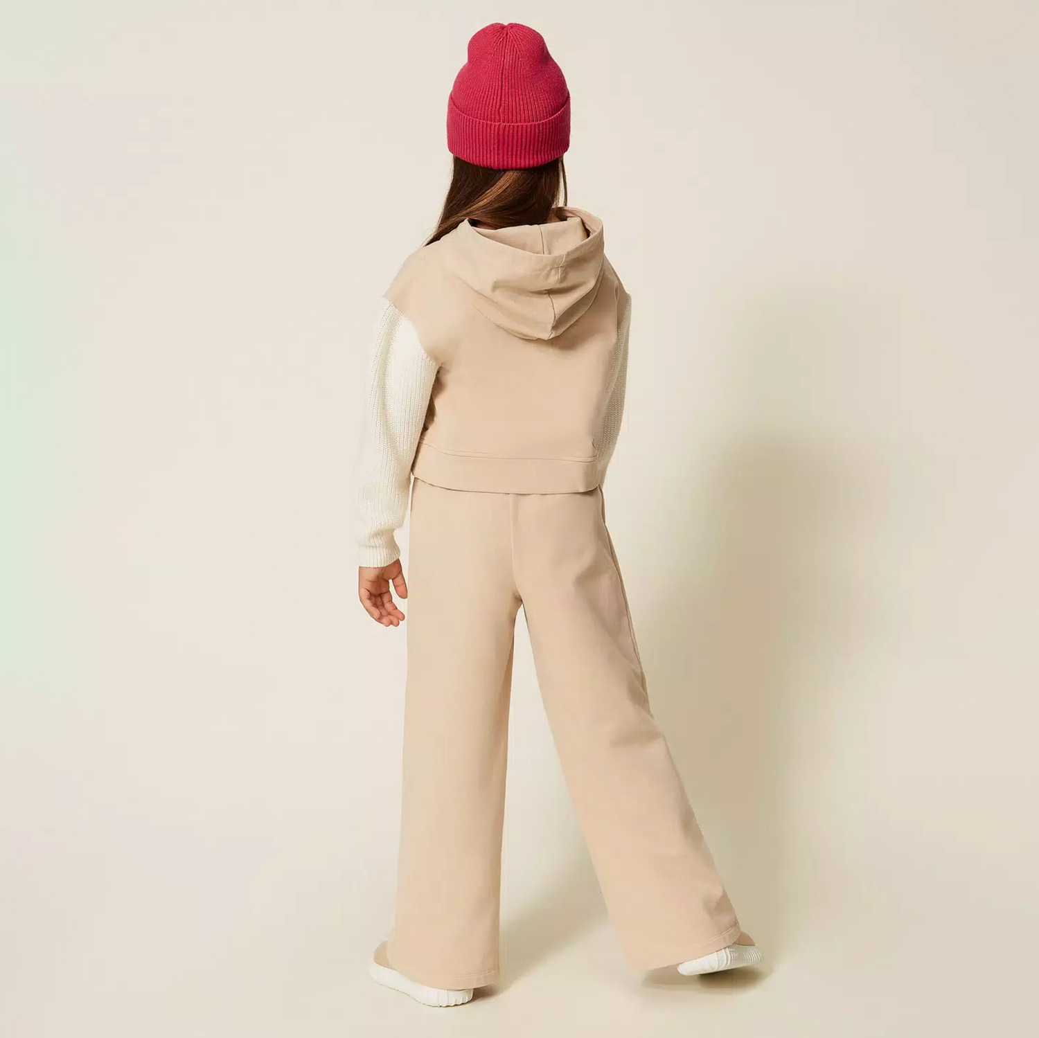Twinset light beige cotton set, featuring a hooded sweatshirt with knitted sleeves and logo in front and matching trousers.