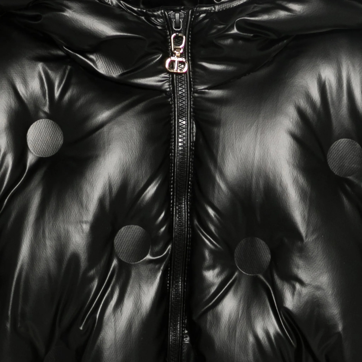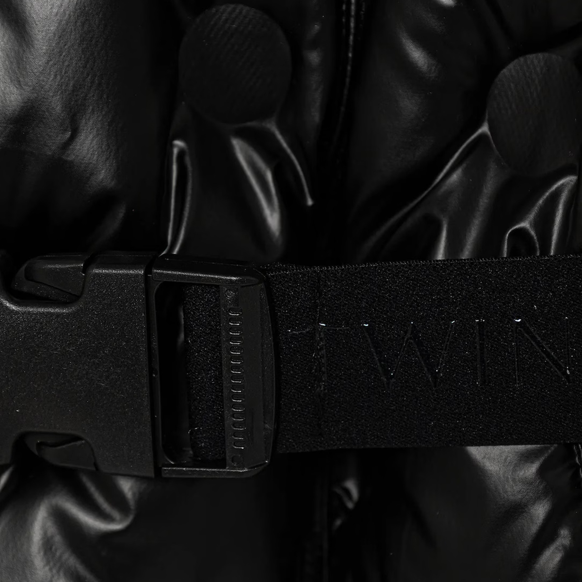 Twinset black puffer jacket with hood. It features a unique fabric pattern detailing, a removable black logo belt and a gold-tone zip fastening.