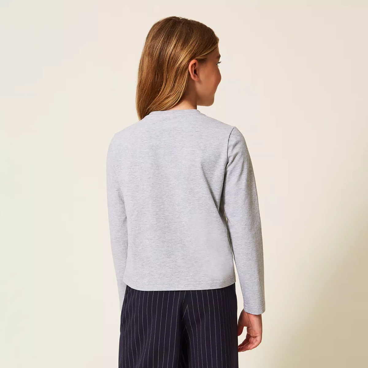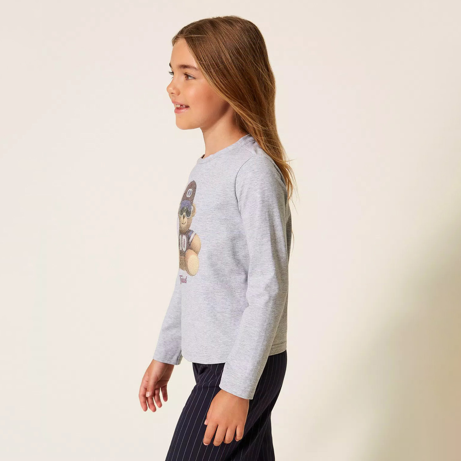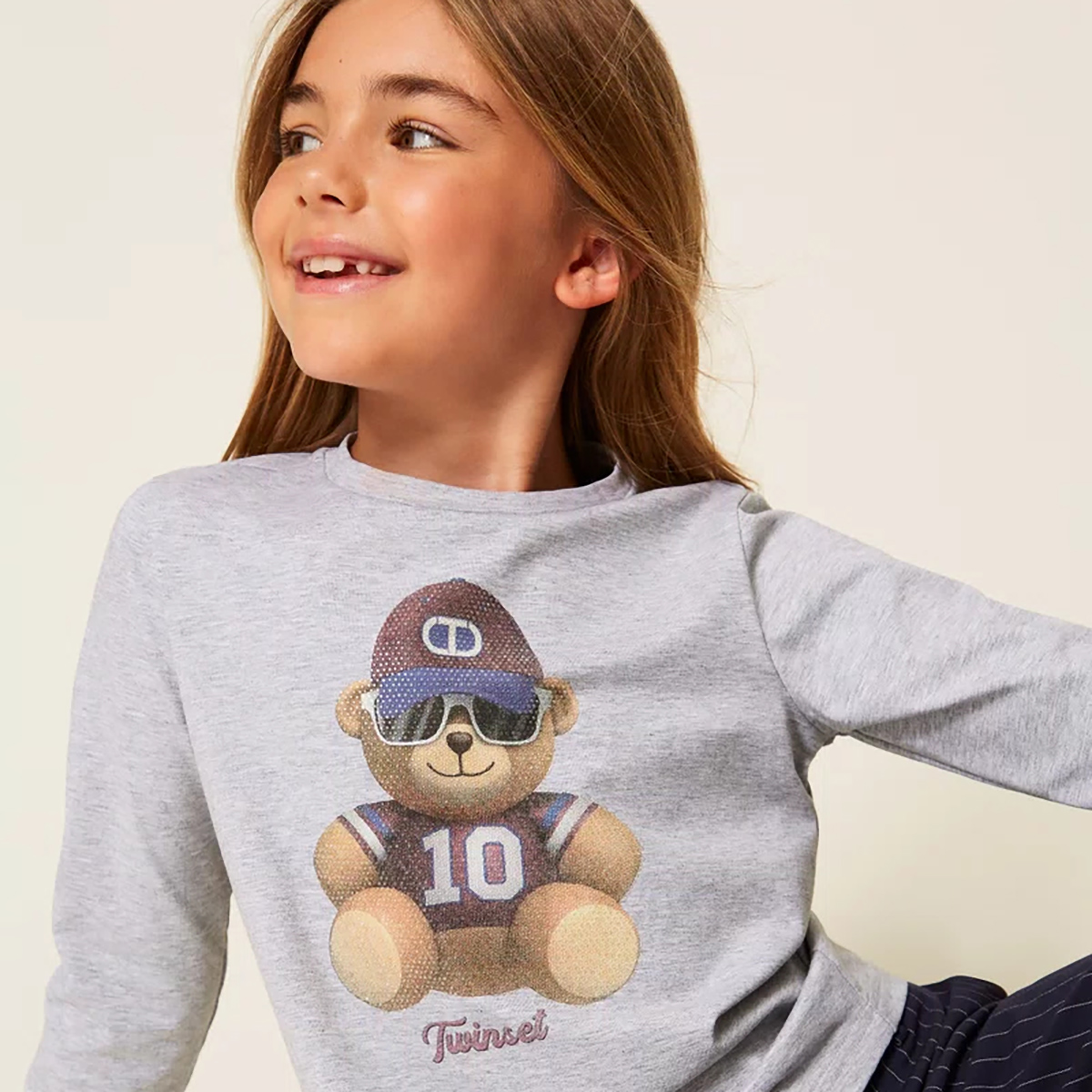 Twinset grey cotton t-shirt featuring a teddy printed in front with rhinestone applications.