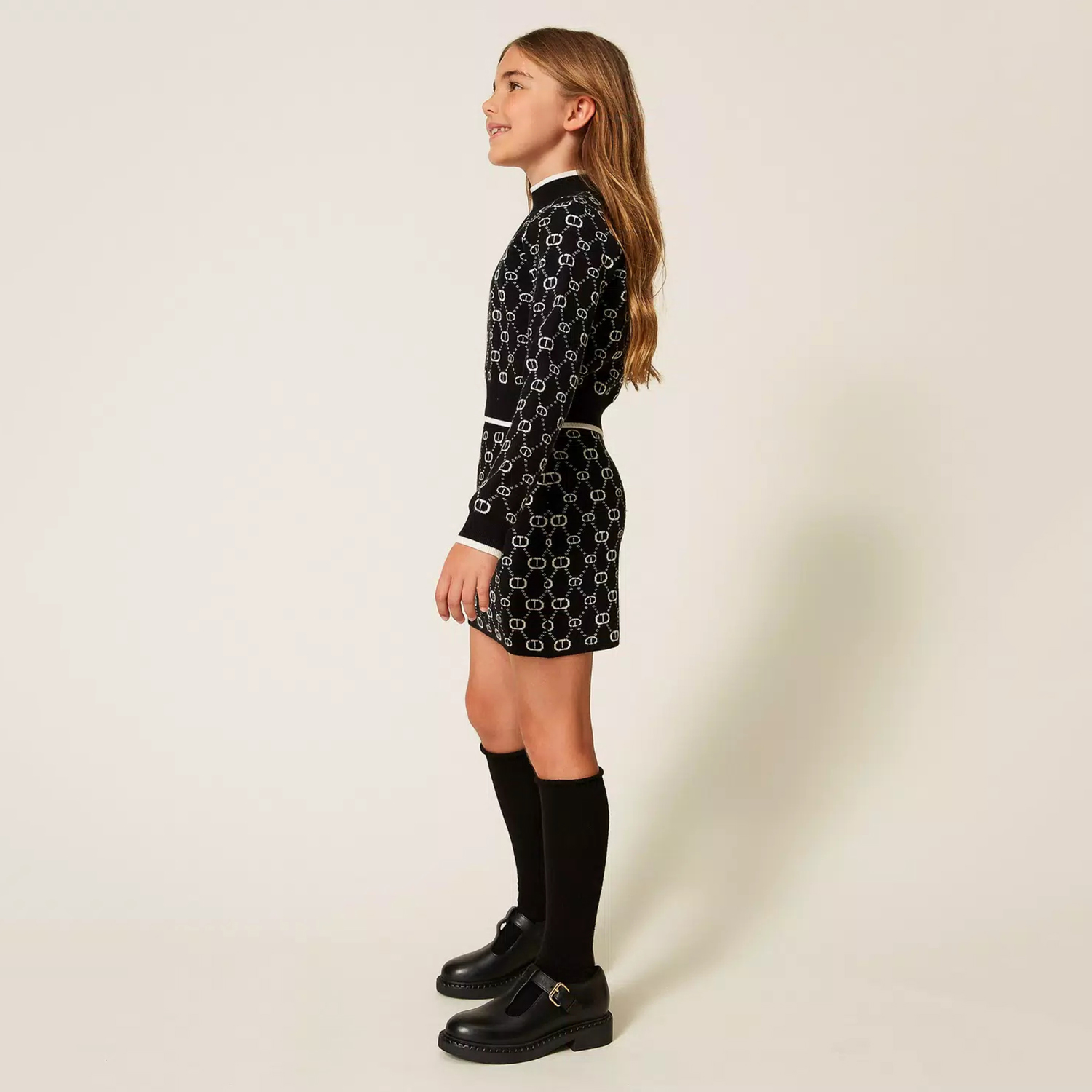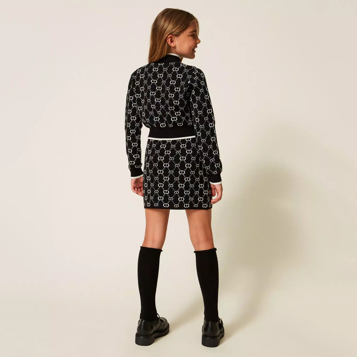 Twinset black knitted viscose set, including a sweater and a skirt. Both feature all-over logo pattern andthey are very soft and elastic.