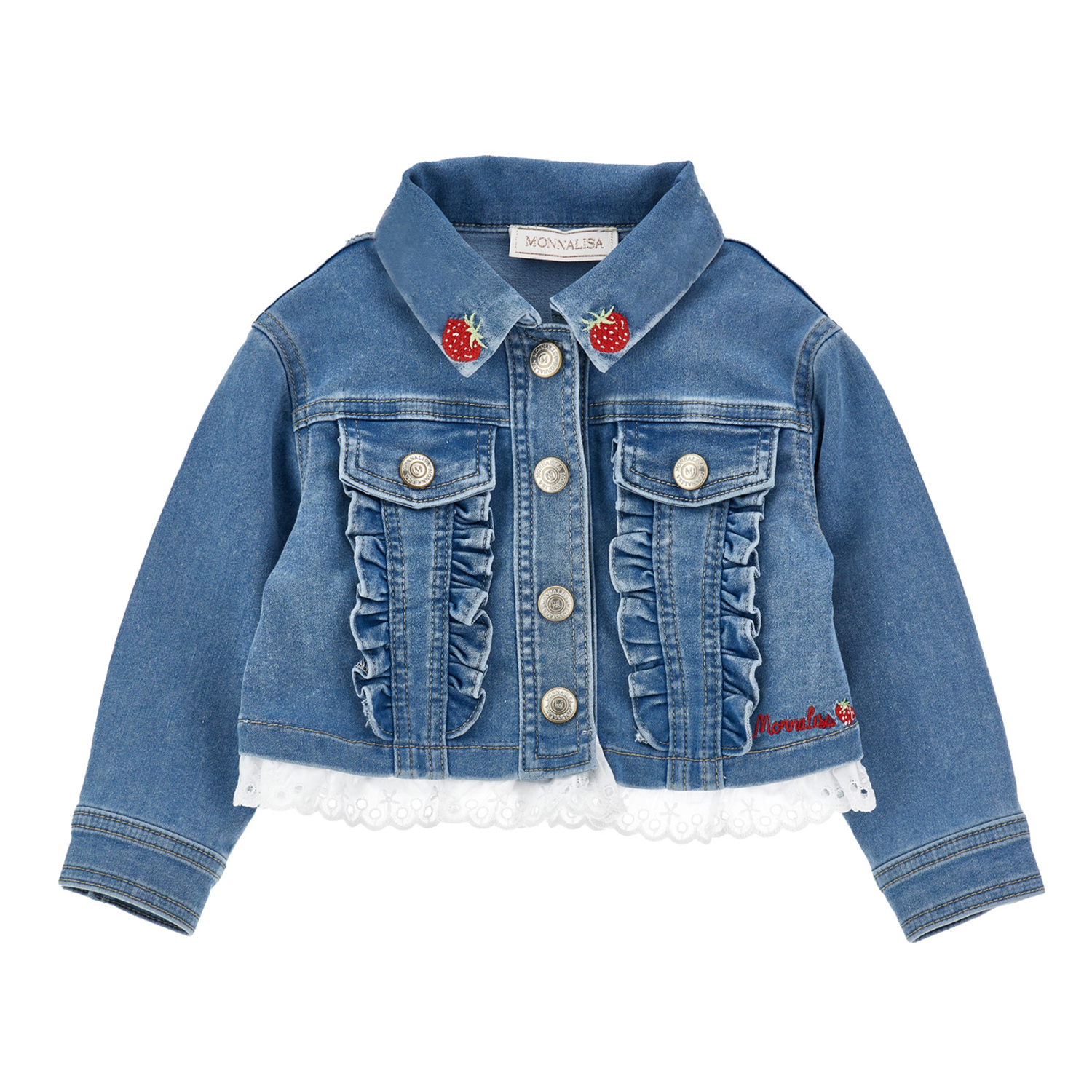 Monnalisa denim blue soft and elasticated skirt featuring an elasticated waistband and strawberry embroideries.