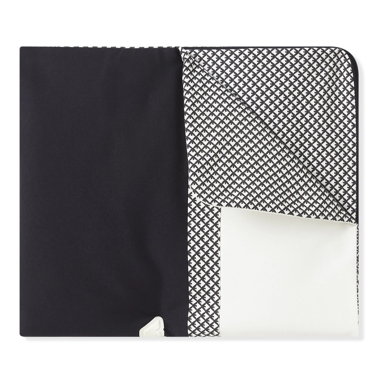 Emporio Armani cotton baby blanket in navy blue and off-white colors. It features all-over printed eagle-logos, plus a logo patch in front.