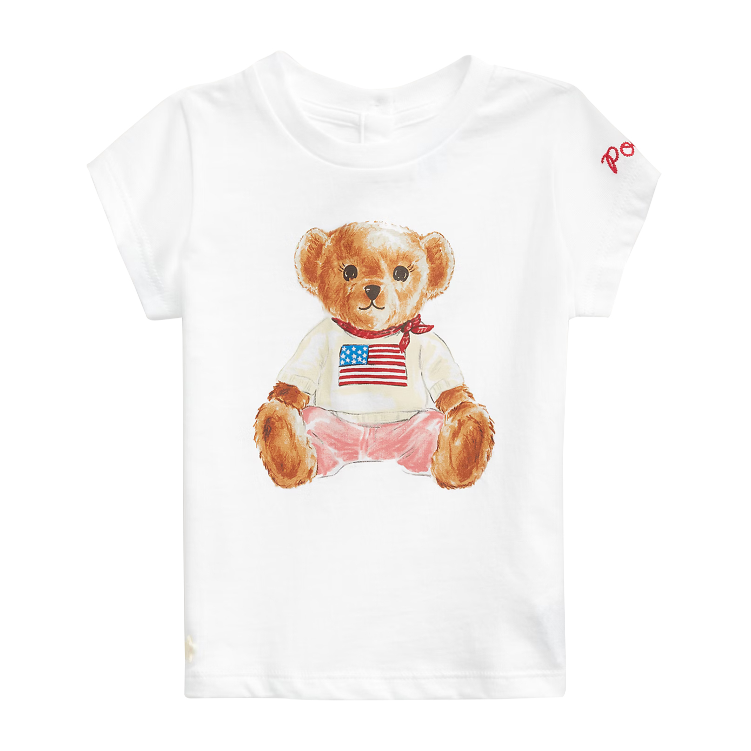 Polo Ralph Lauren white organic cotton T-shirt featuring a Teddy figure printed in front and snap buttons fastening on the back.