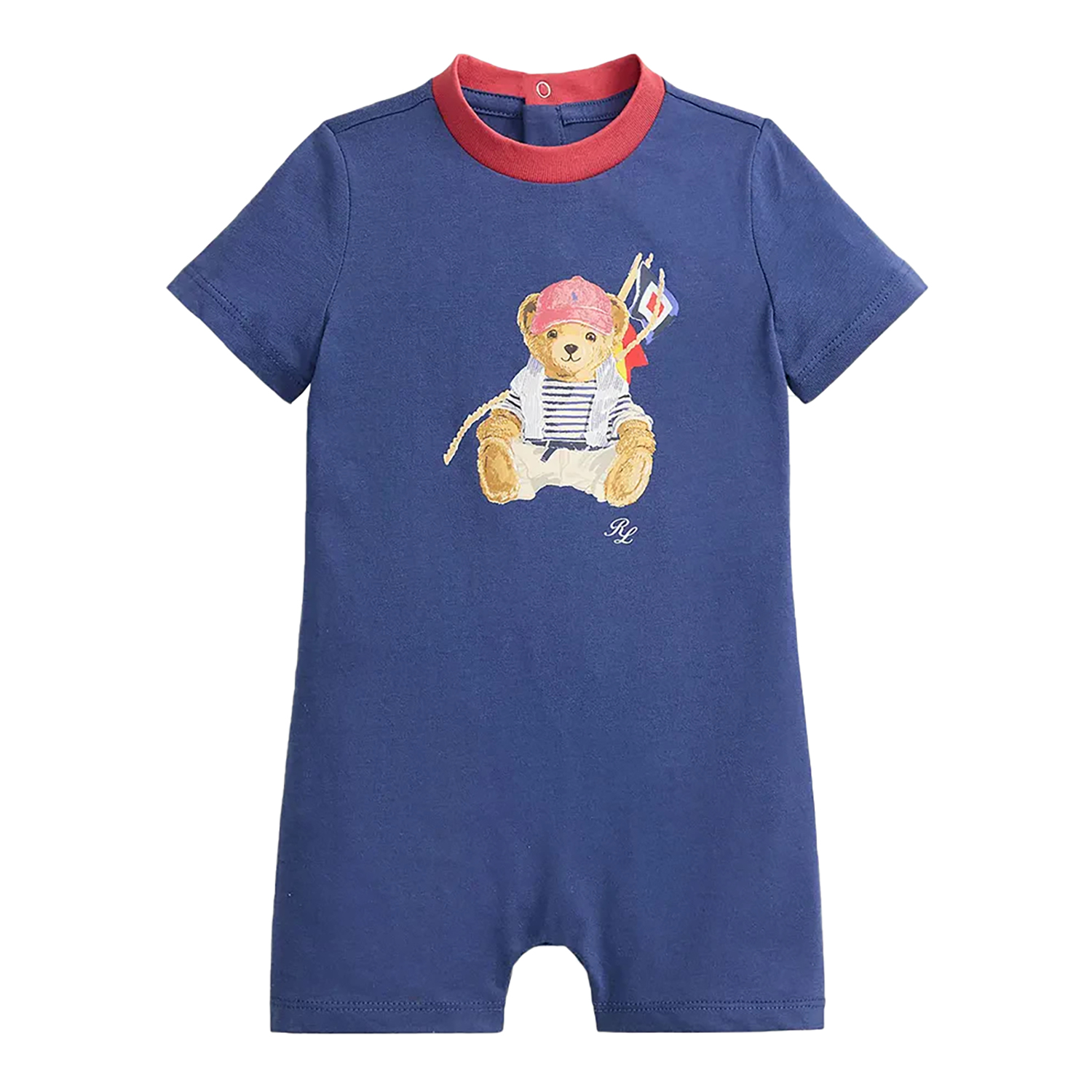 Polo Ralph Lauren blue organic cotton short bodysuit featuring a Teddy stamp in front and snap button fastening.