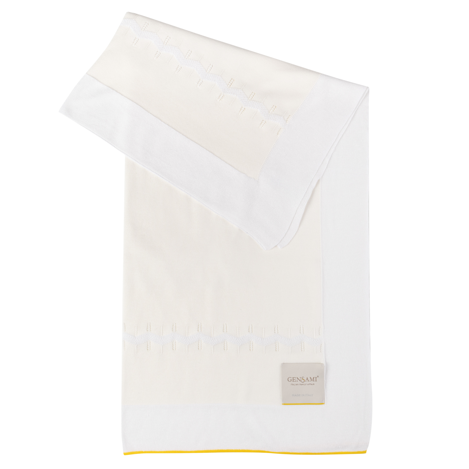 Gensami off-white knitted set of a bonnet (baby cap) and matching socks made of extra fine Mulberry Silk and organic cotton. Both feature the iconic yellow-thread symbol.