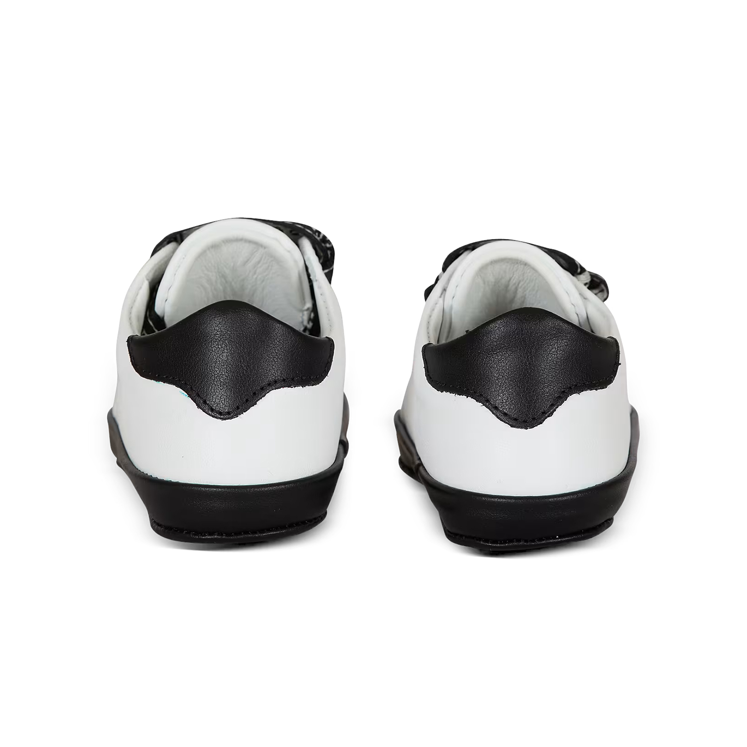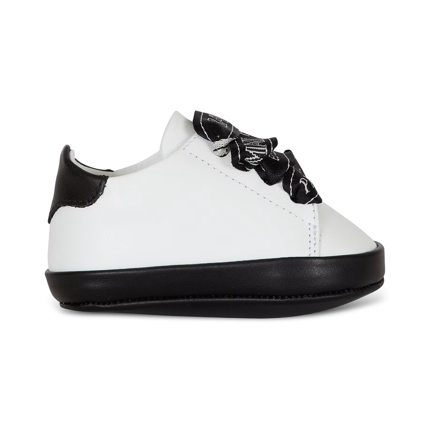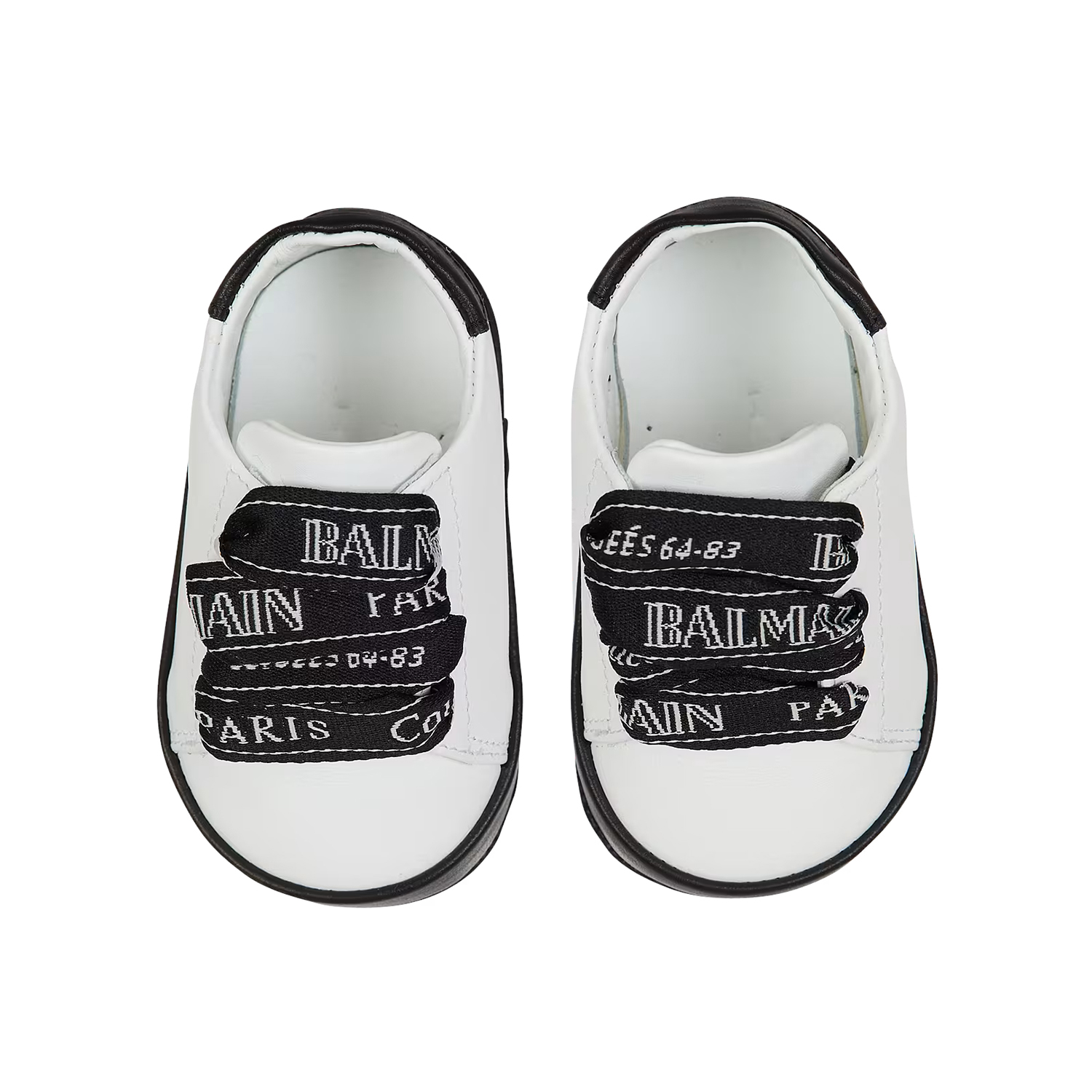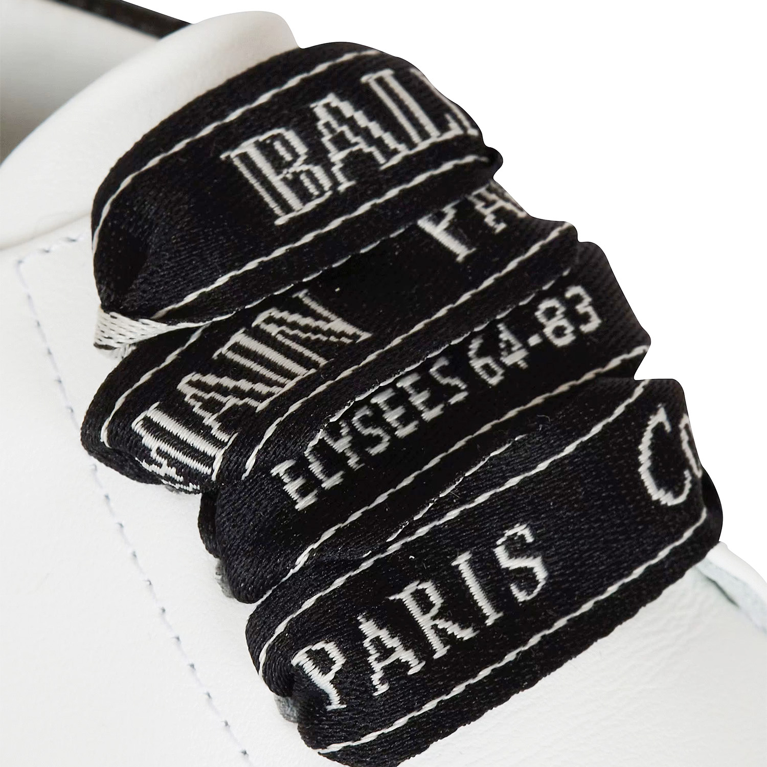 Balmain Paris white leather cuddle shoes with black logo drawstrings and black sole.