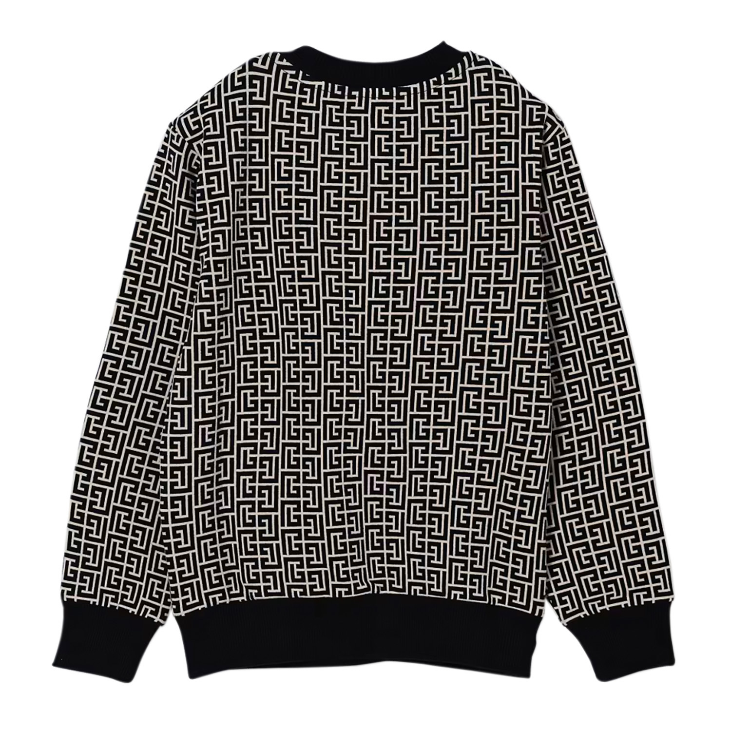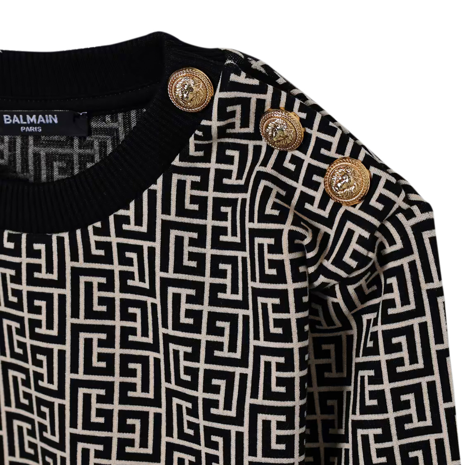 Balmain Paris black cotton sweatshirt featuring jacquard labyrinth pattern and gold logo buttons.