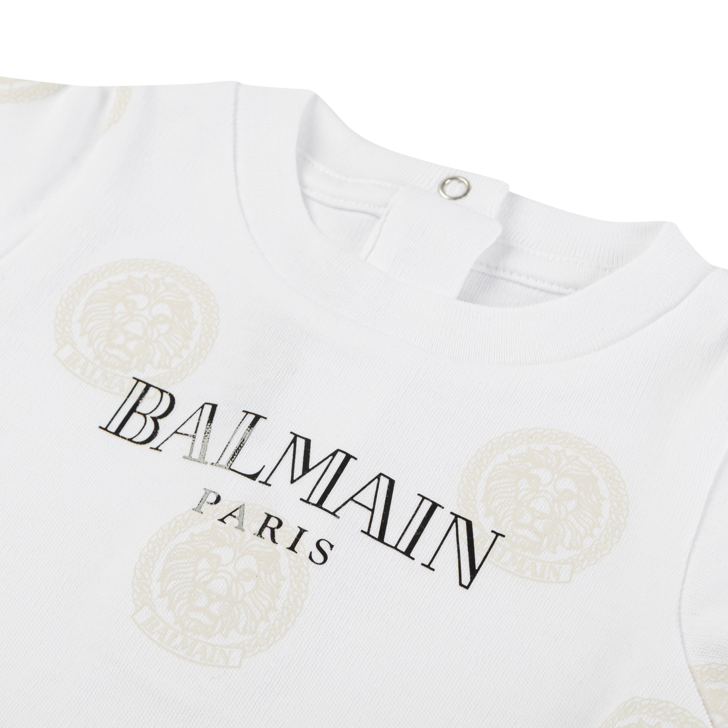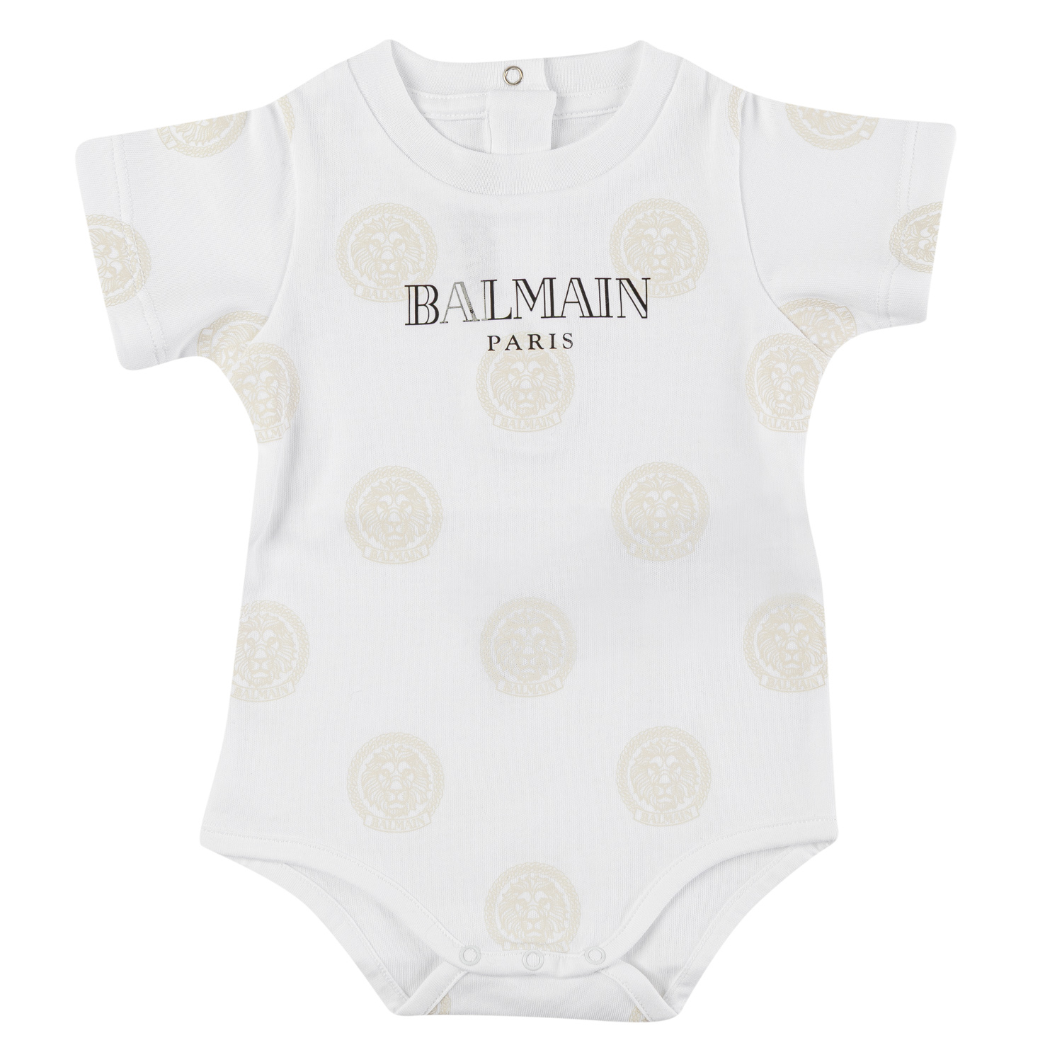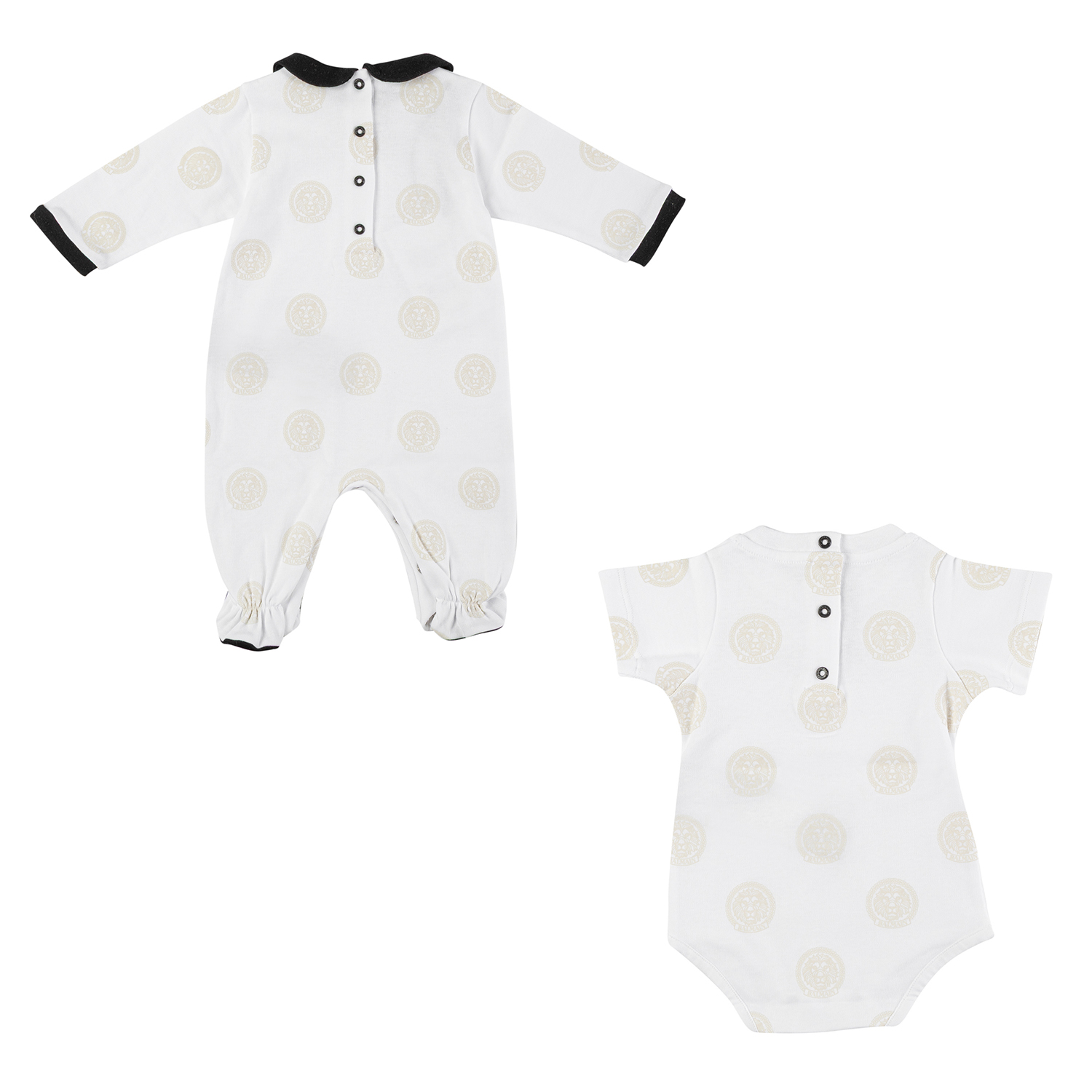 Balmain Paris white cotton maternity set featuring a bodysuit and an underwear. It has black details, buttons and printed logo.