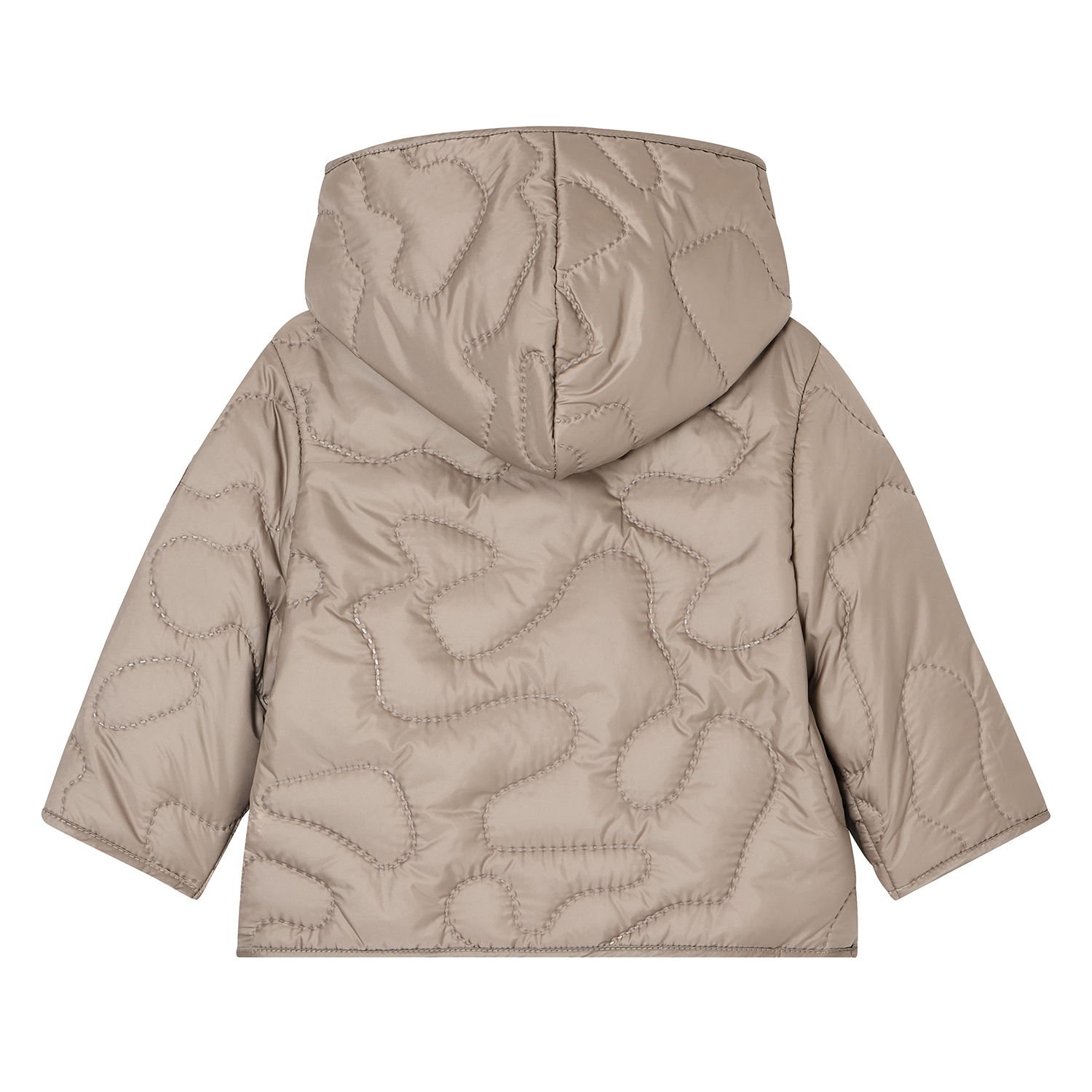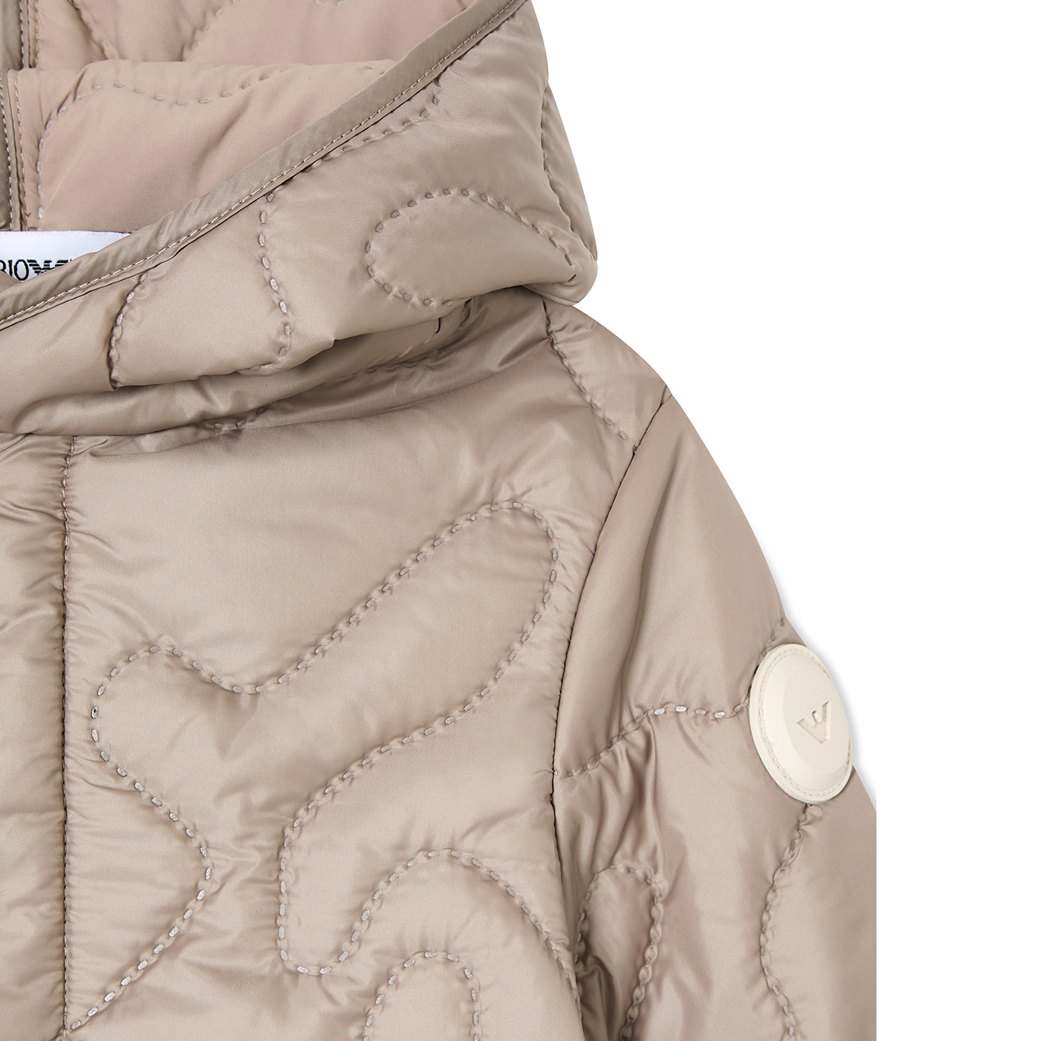 Emporio Armani beige-brown light hooded jacket with geometrical design. It features snap button and zip fastening and two pockets.