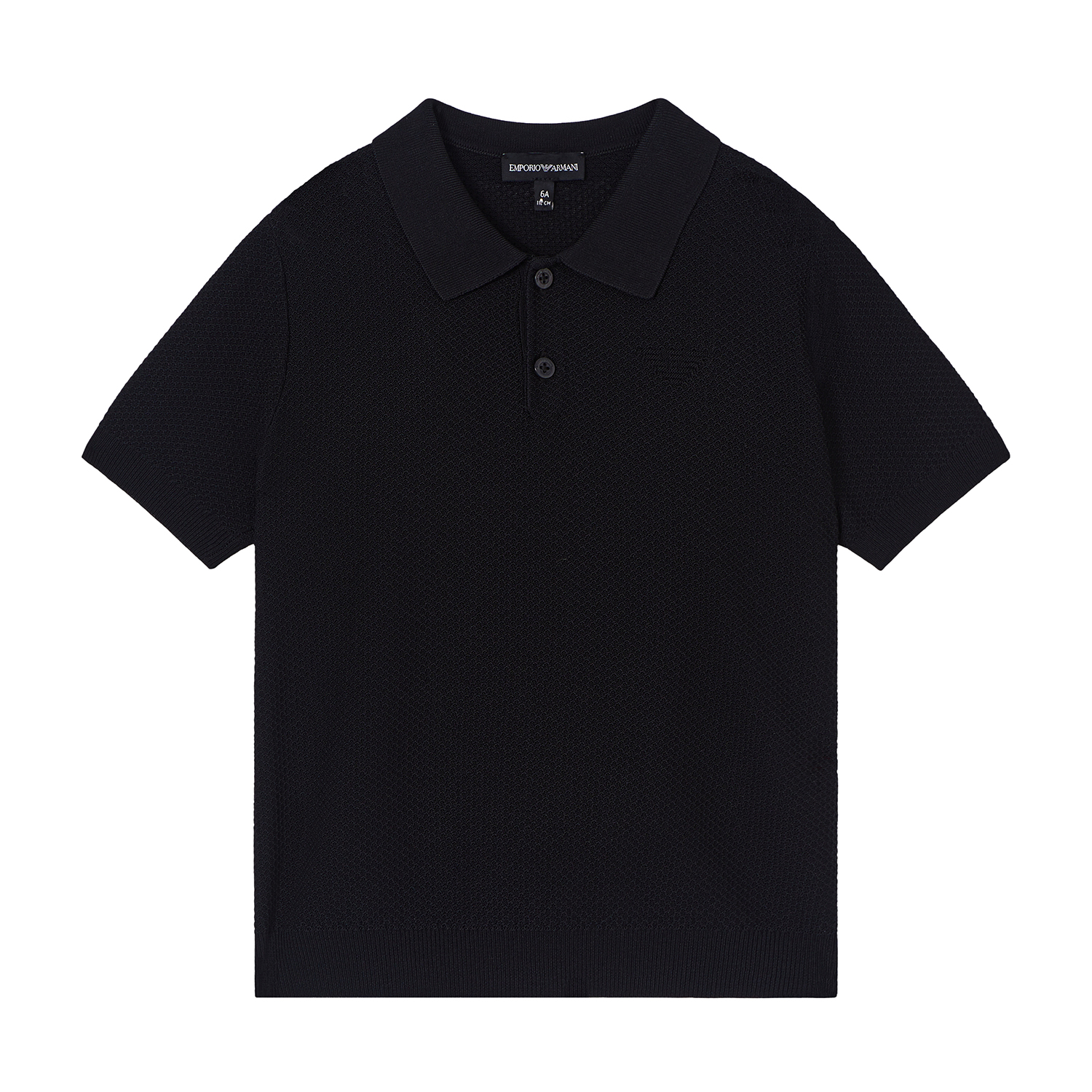 Emporio Armani navy blue pique t-shirt with ribbed polo collar, sleeves and revert.