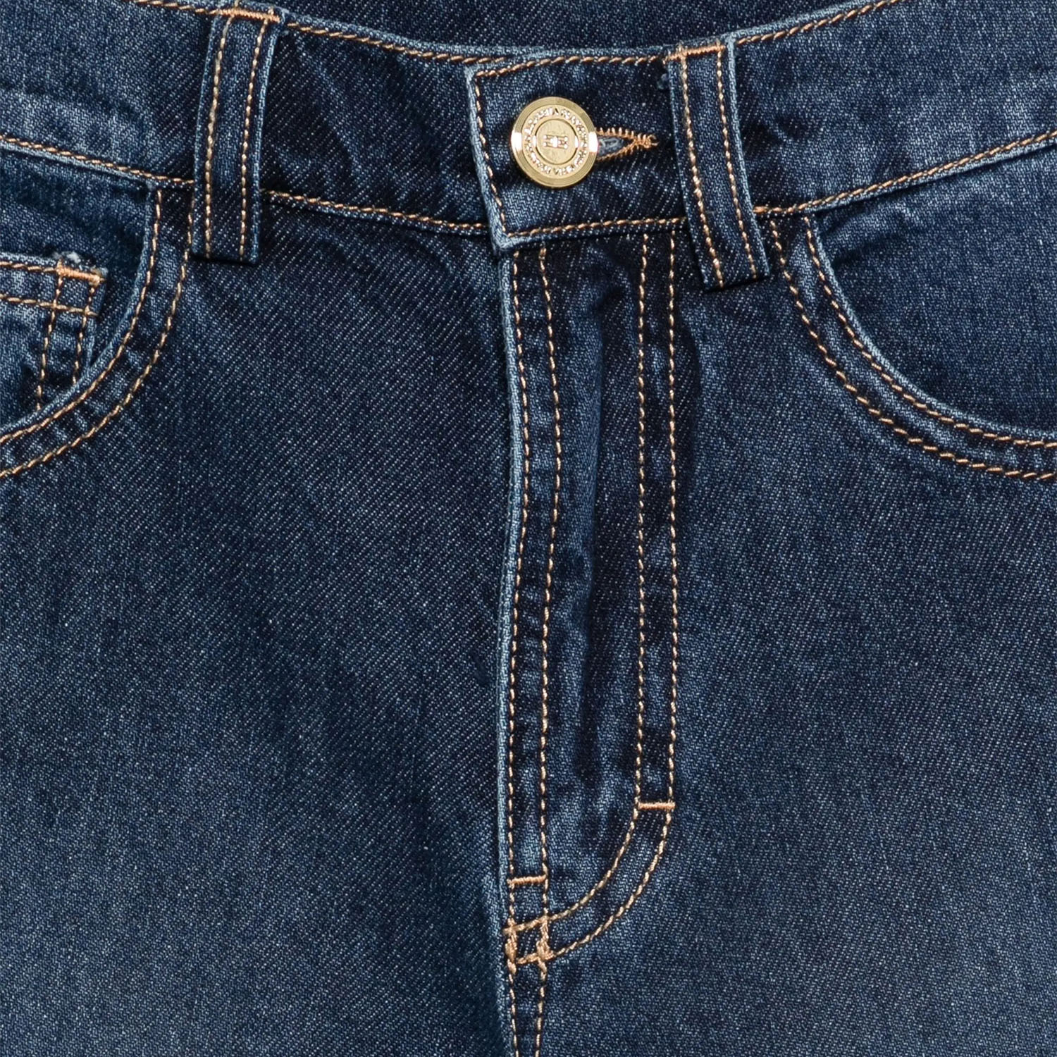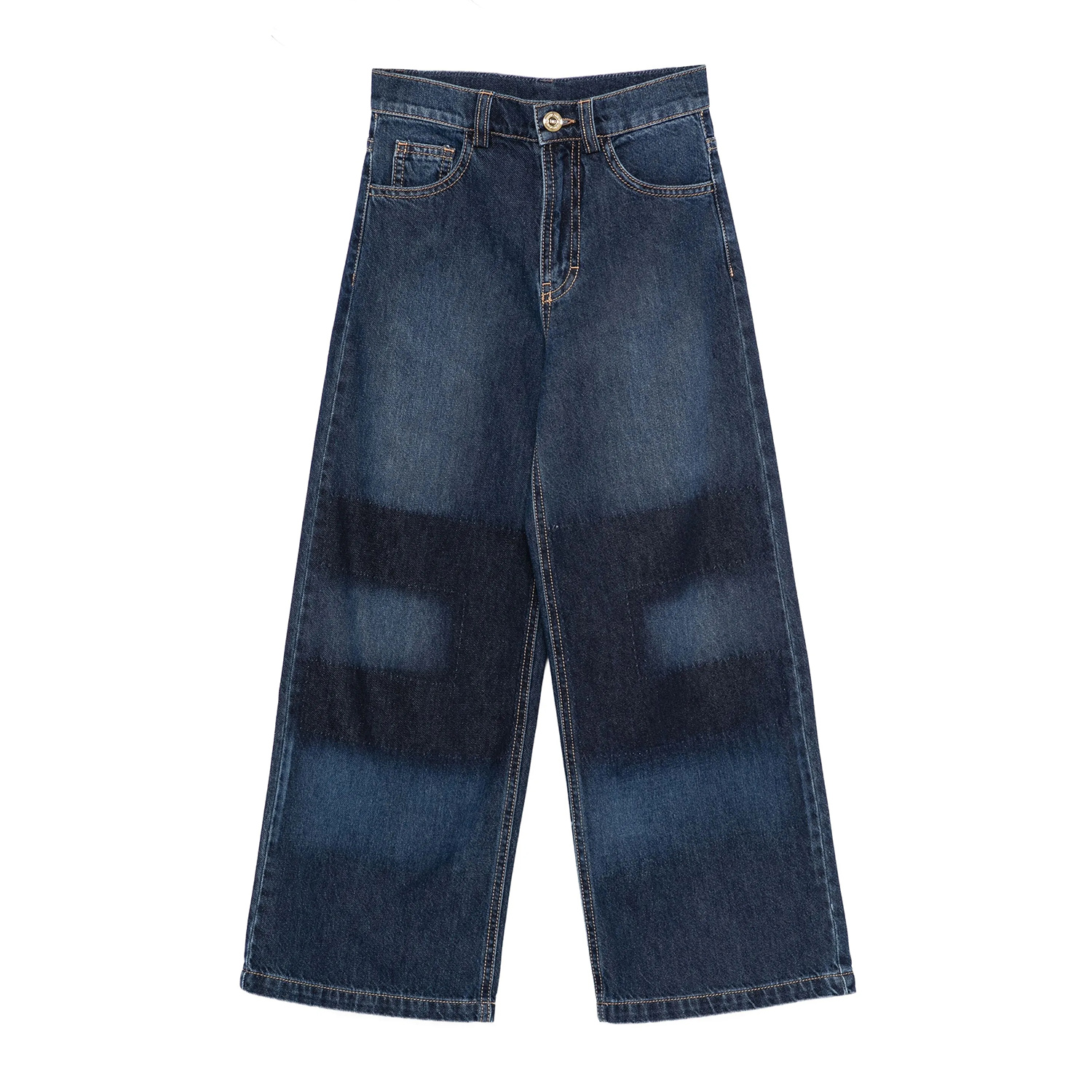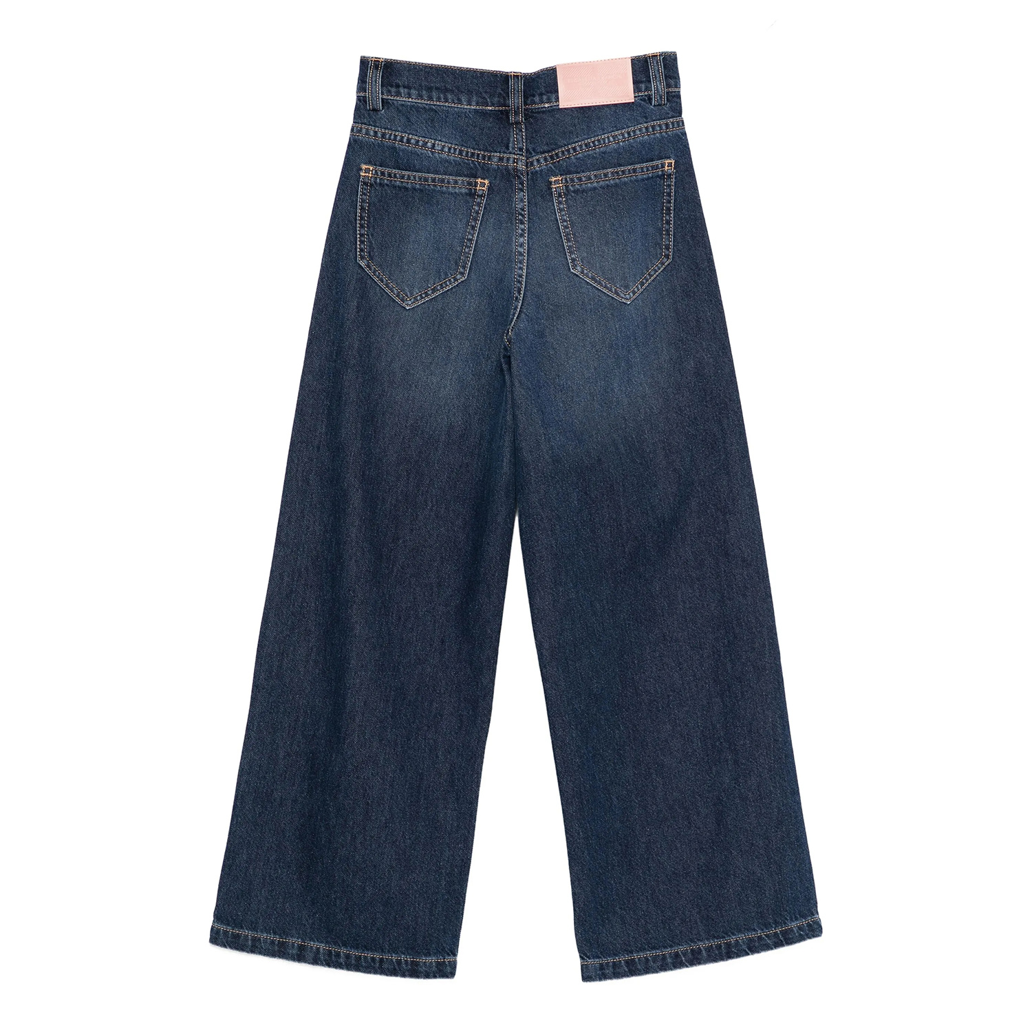 Elisabetta Franchi dark blue denim cotton trousers with A-line wide leg style and tie-dye logo on the knee part.