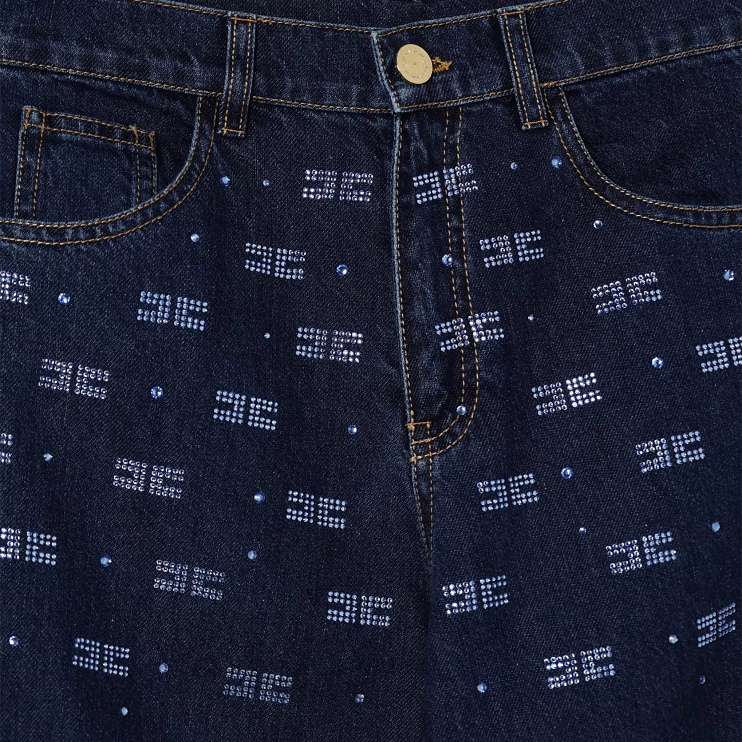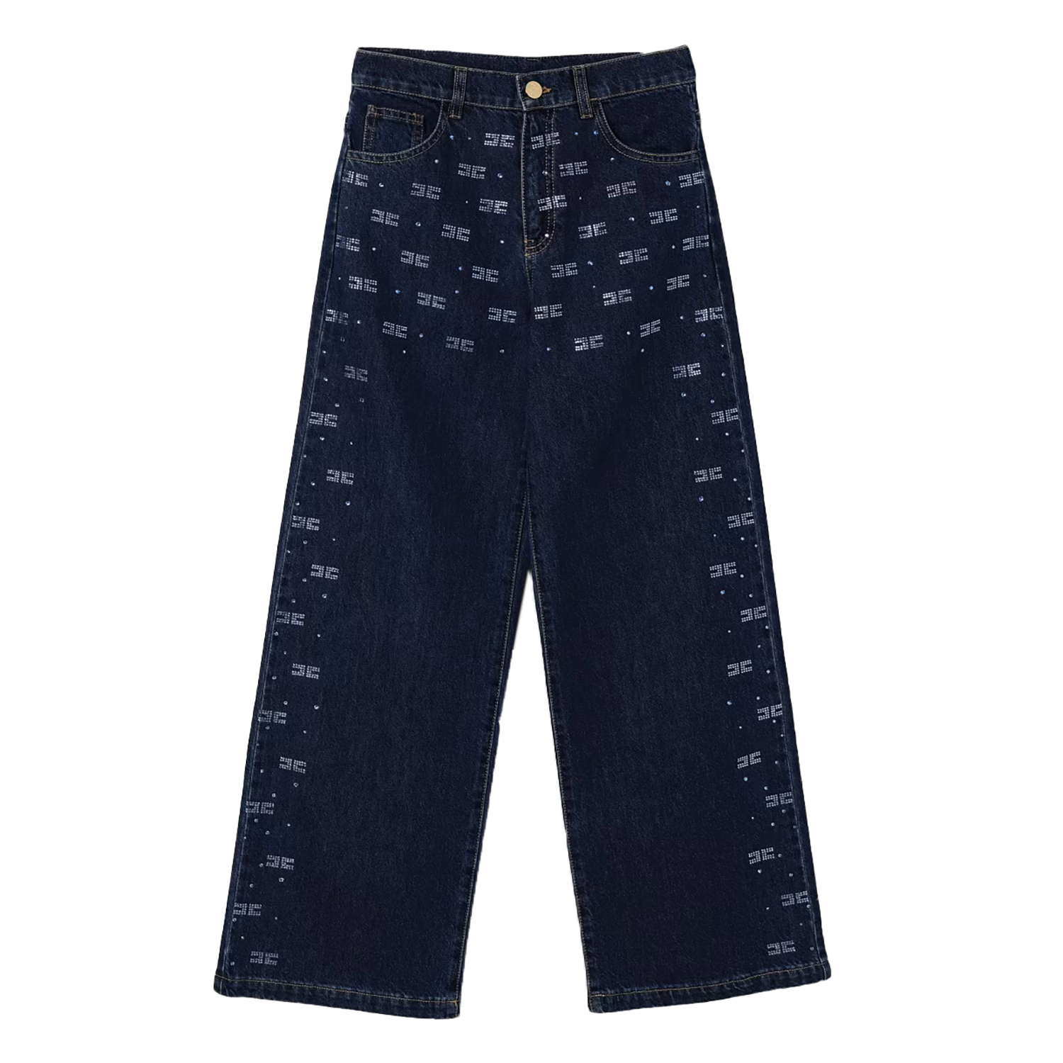 Elisabetta Franchi dark blue denim cotton trousers with rhinestone logo applications.