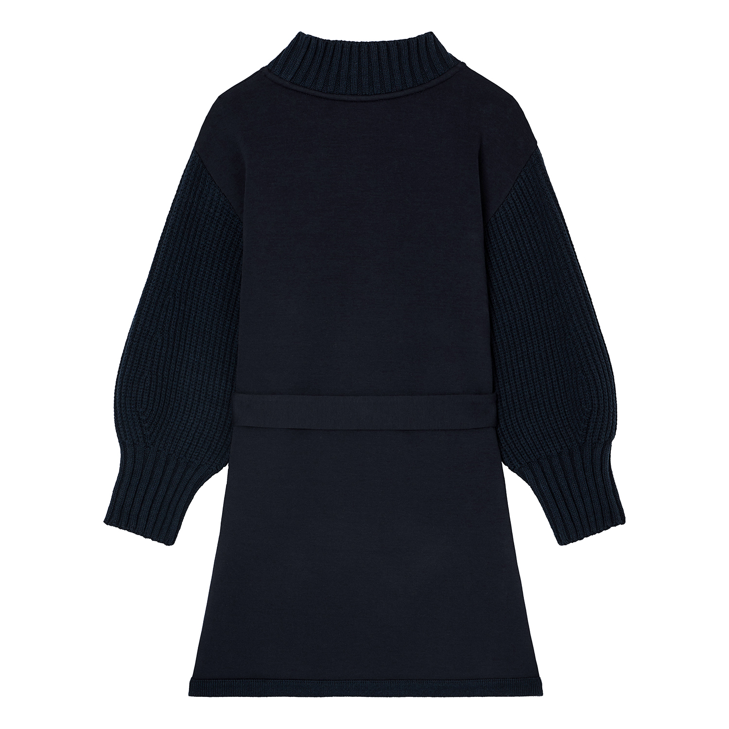 Emporio Armani navy blue organic cotton dress with ribbed knitted collar and sleeves, featuring an embroidered logo on the chest and a belt. It is very soft and elastic.
