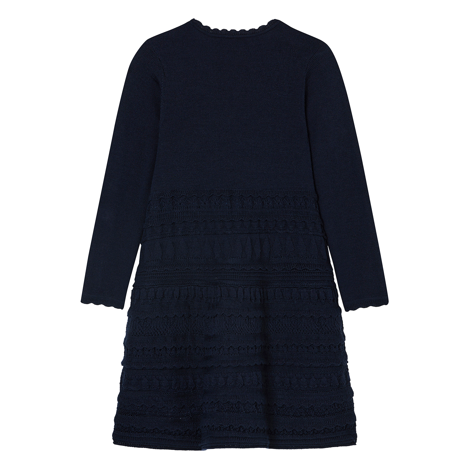 Emporio Armani navy blue knitted dress made of virgin wool. It is hypoallergenic, soft and warm, featuring wavy details on the knit and a small logo.