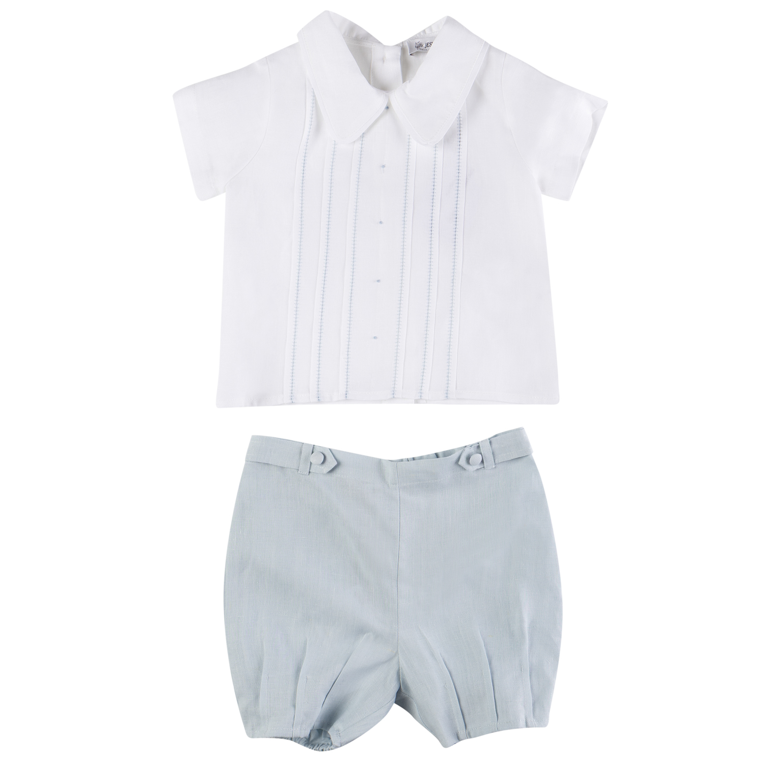 Jesurum Venice 100% linen set, featuring a white shirt with light blue nervir details and light blue shorts, with an elasticated waistband.