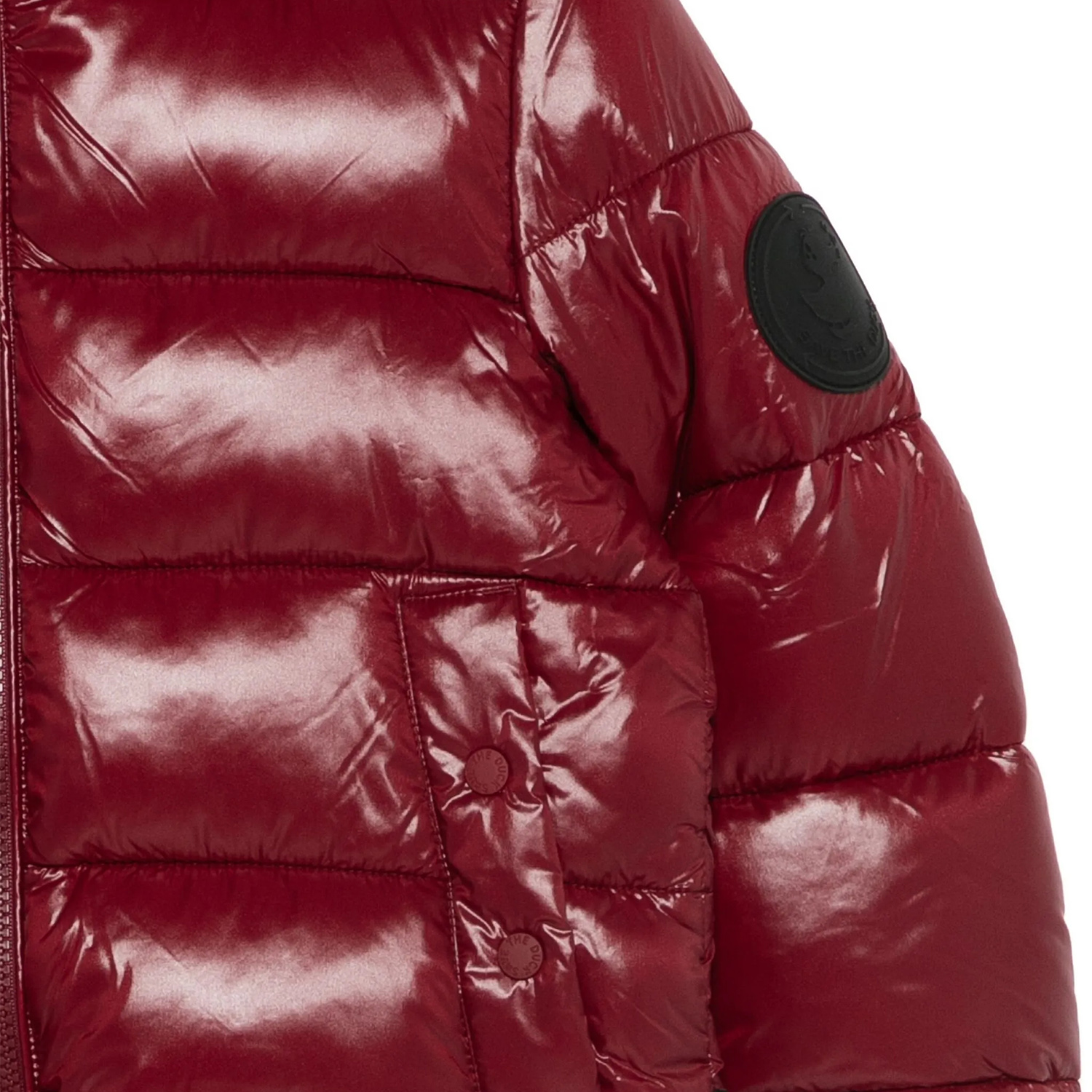Save the Duck bordeaux puffer padded jacket with Animal-Free, eco-friendly padding. It features elasticated cuffs, waist and a silicon logo on the side.
