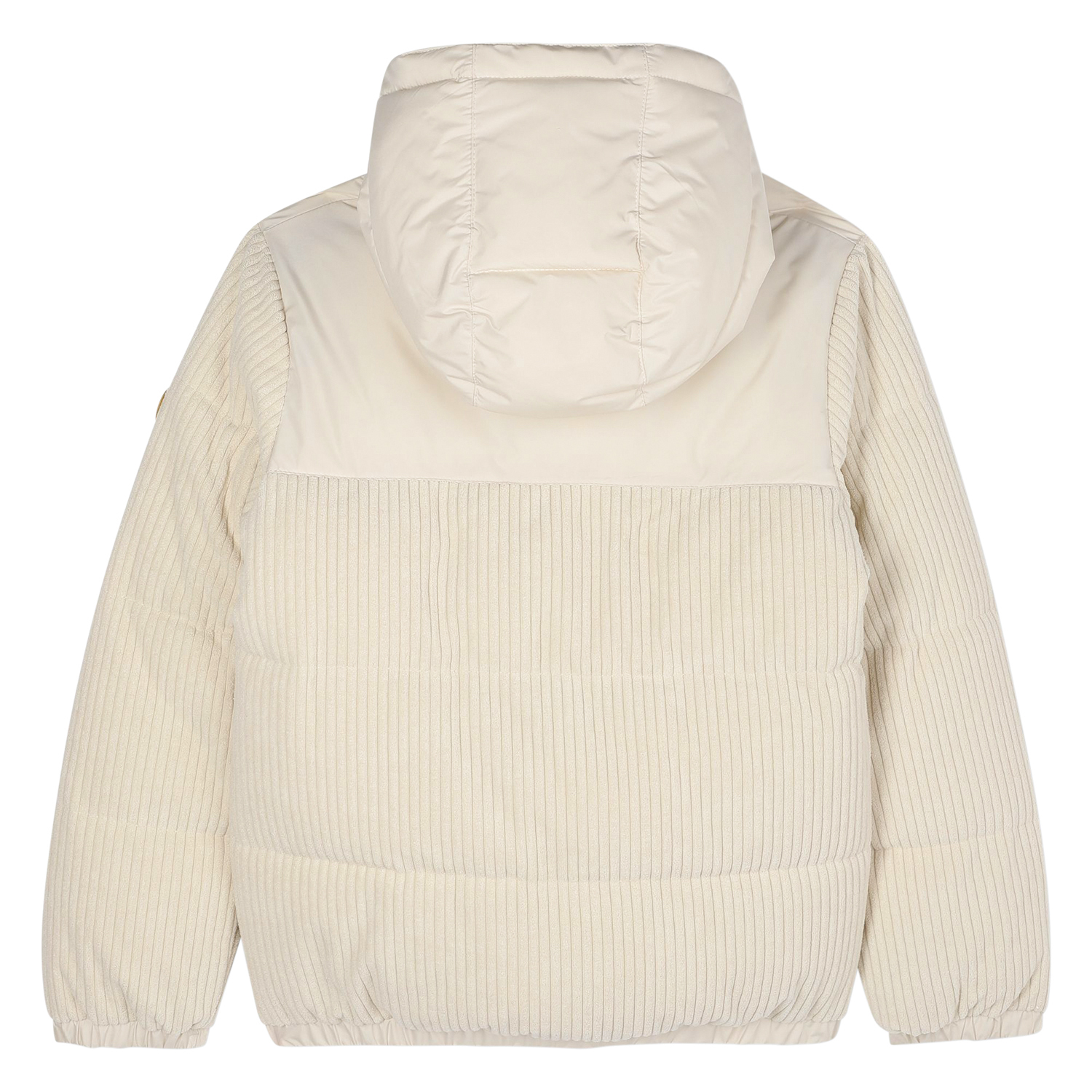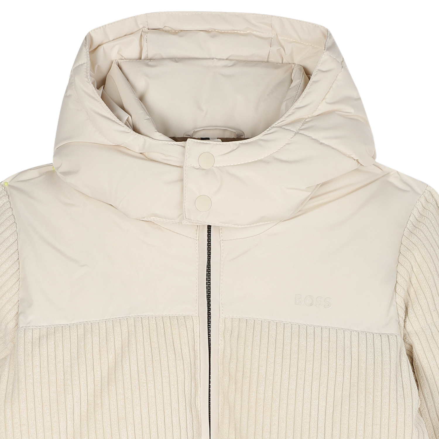 Hugo Boss ivory-ecru corduroy puffer jacket with attached hood, two pockets, logo on the side and elasticated parts.
