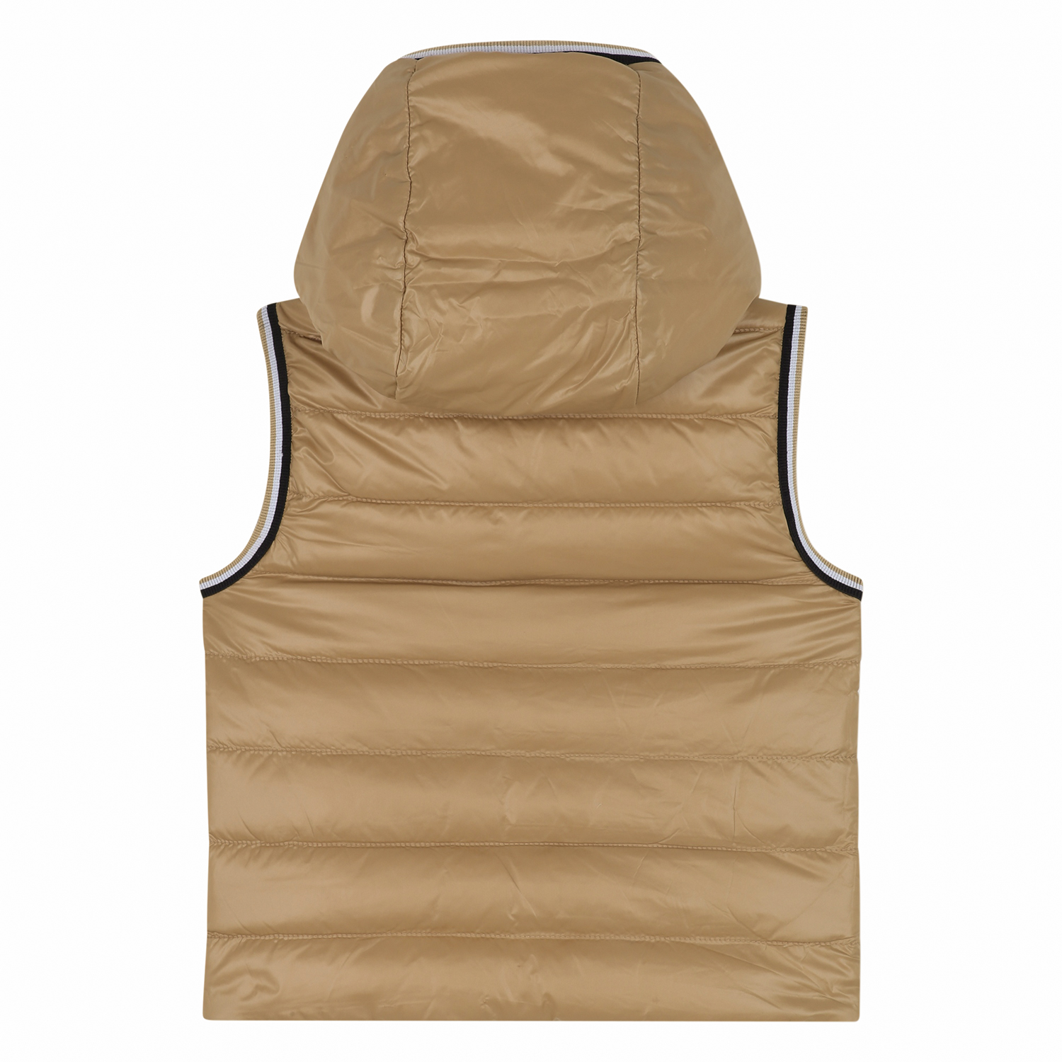 Hugo Boss reversible light padded gilet in ivory and cookie-beige color combination. It features an attached hood, zip fastening, discreet logos and striped details on the armprints.