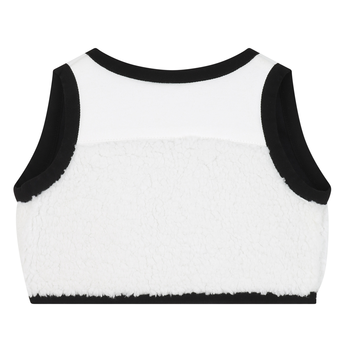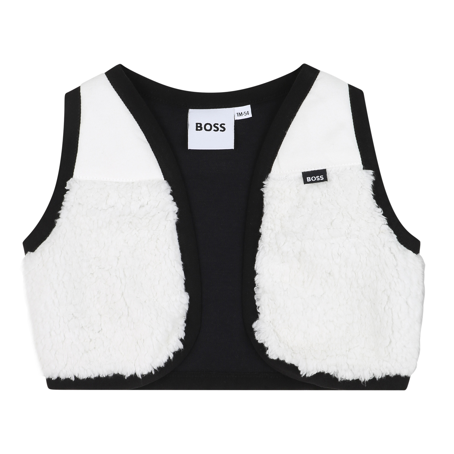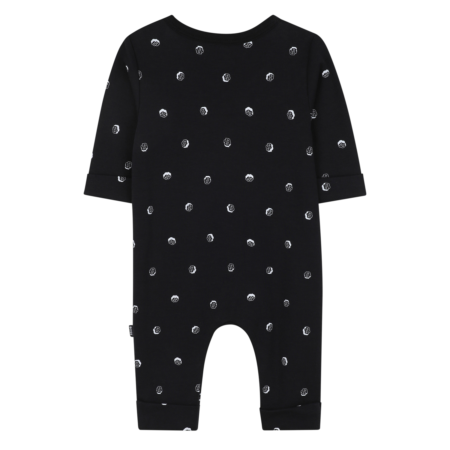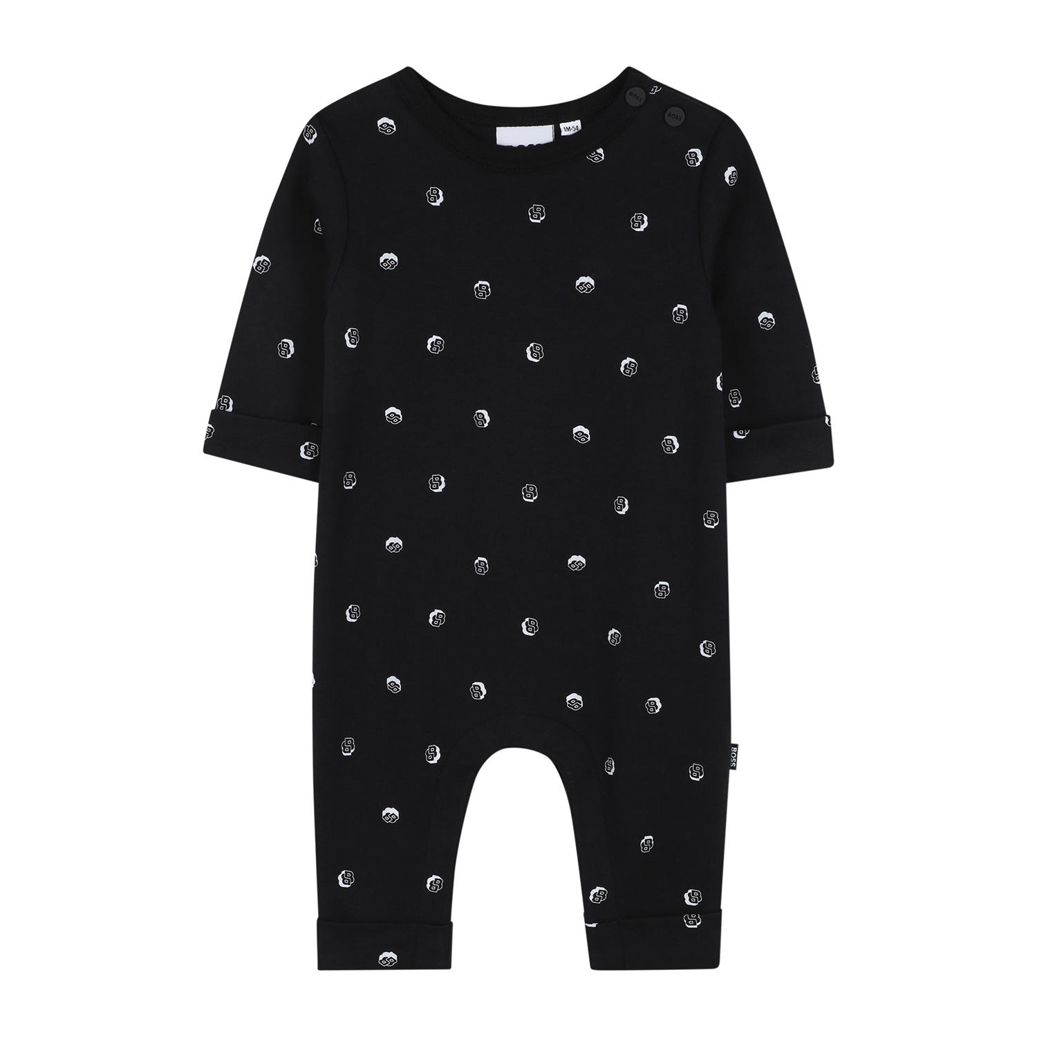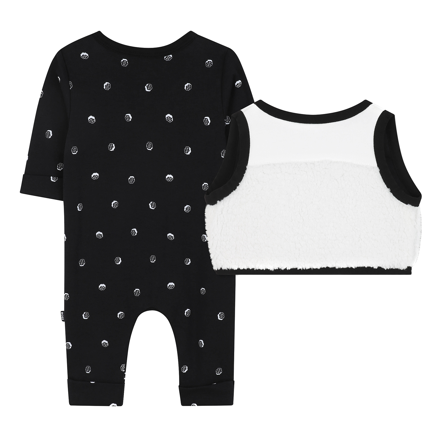 Hugo Boss black cotton set of a bodysuit and a matching cardigan. The bodysuit has monogram pattern printed and the cardigan has boucle-ecofur part.