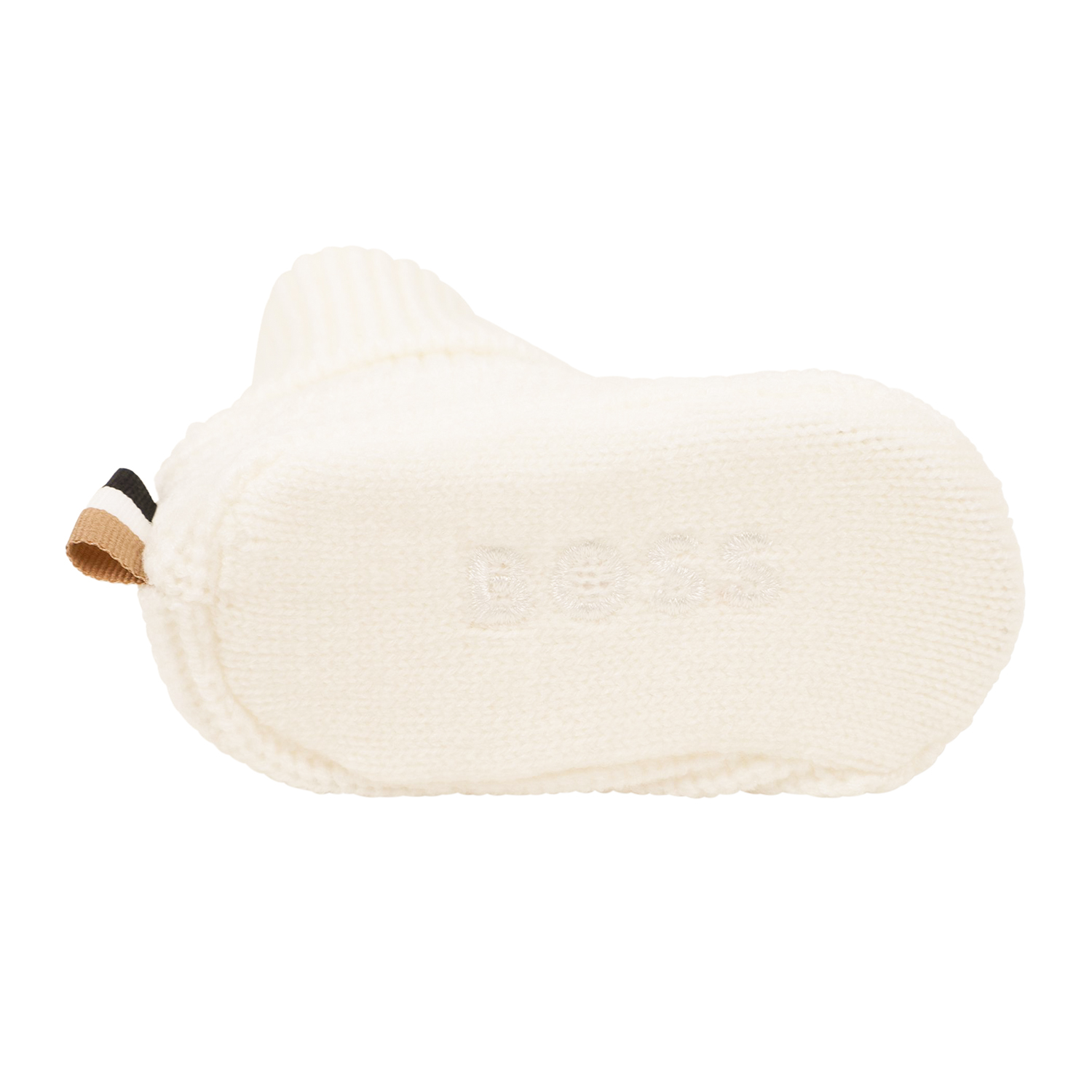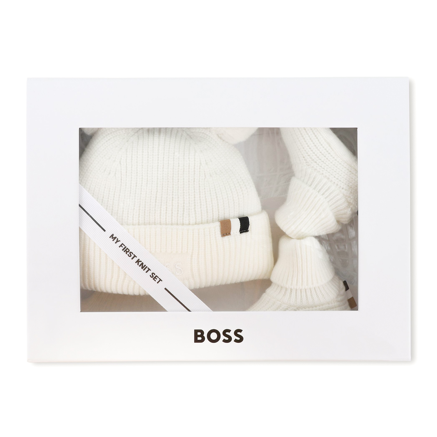 Hugo Boss off-white cotton knitted set of a cap and shoesocks. Both garments feature striped details and logo. Gift box is included.
