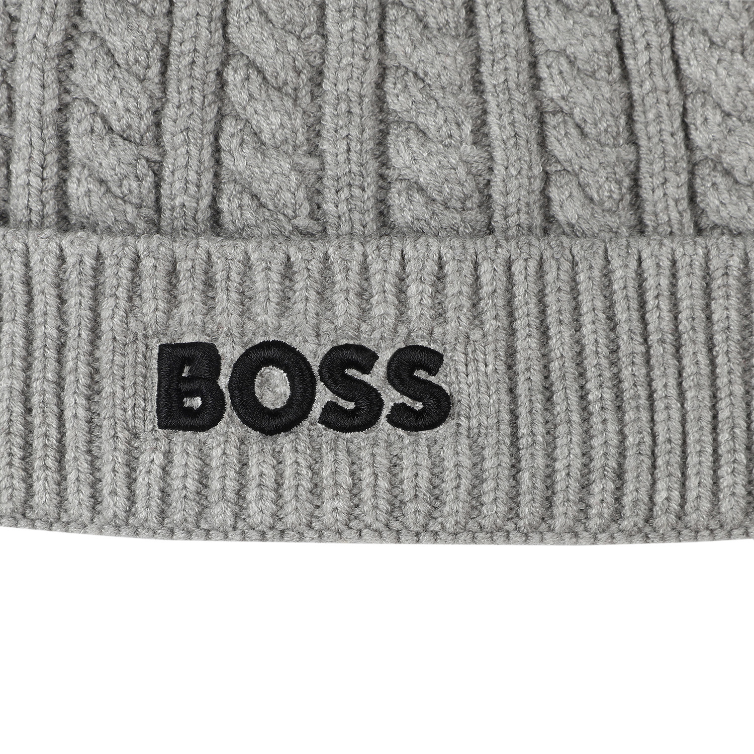 Hugo Boss grey viscose knitted cap with a tassel and an embroidered logo.