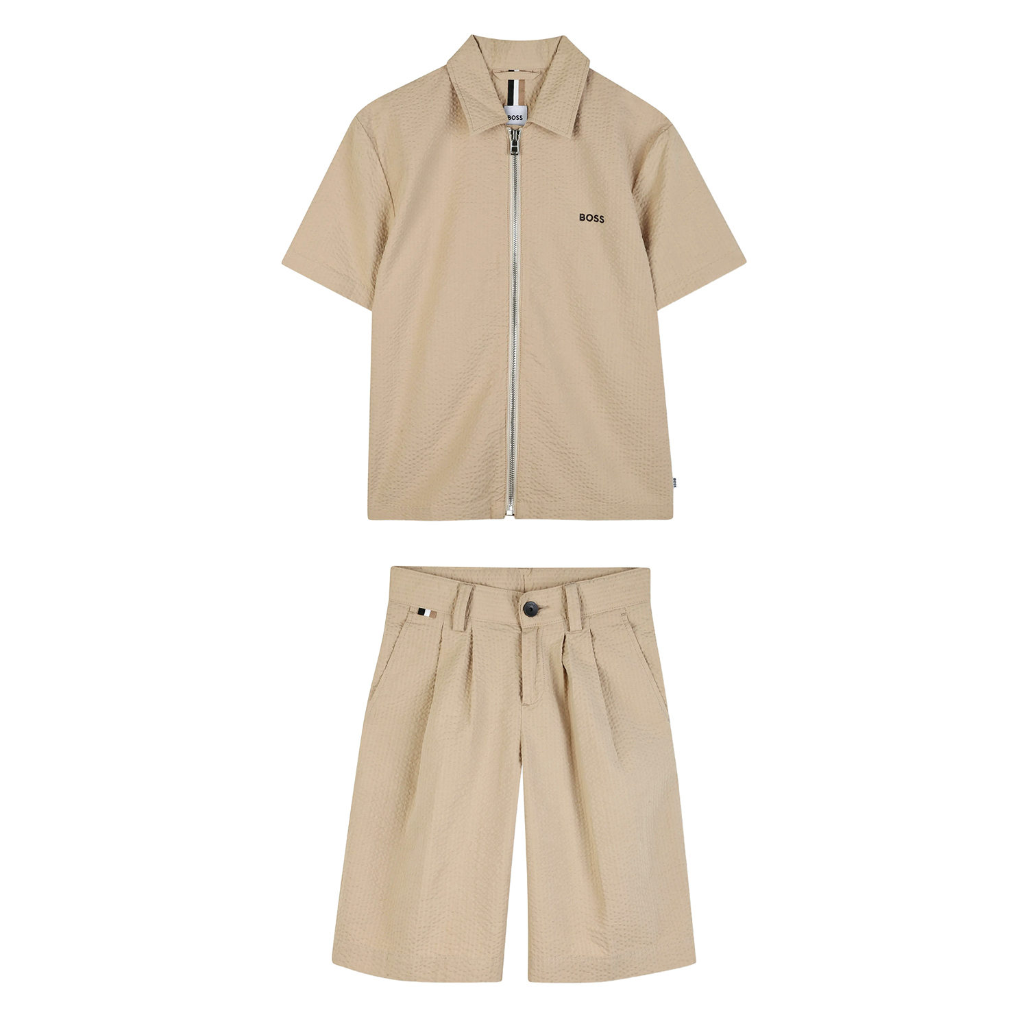 Hugo Boss cotton waffle set in beige color. The upper part is a loose fit zip-up jacket with a classic collar and a logo. The bermuda has also a loose fit with pleated design and an elasticated waistband with elastic adjusters inside of the waist.