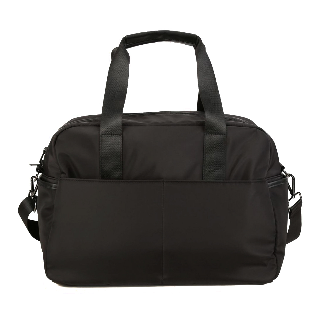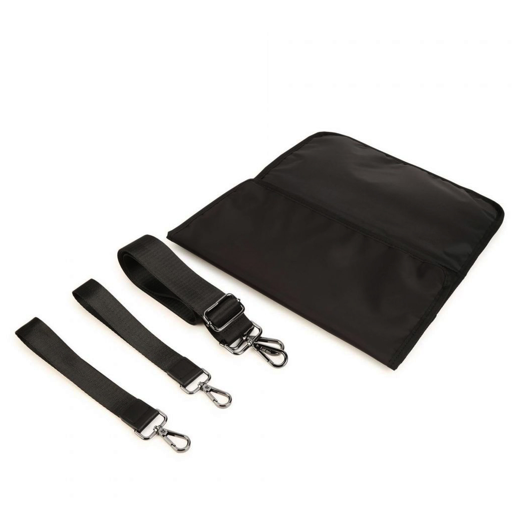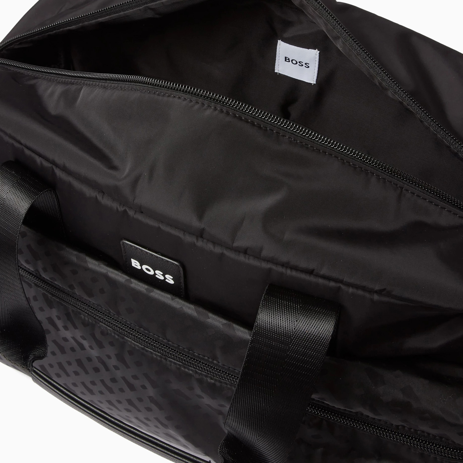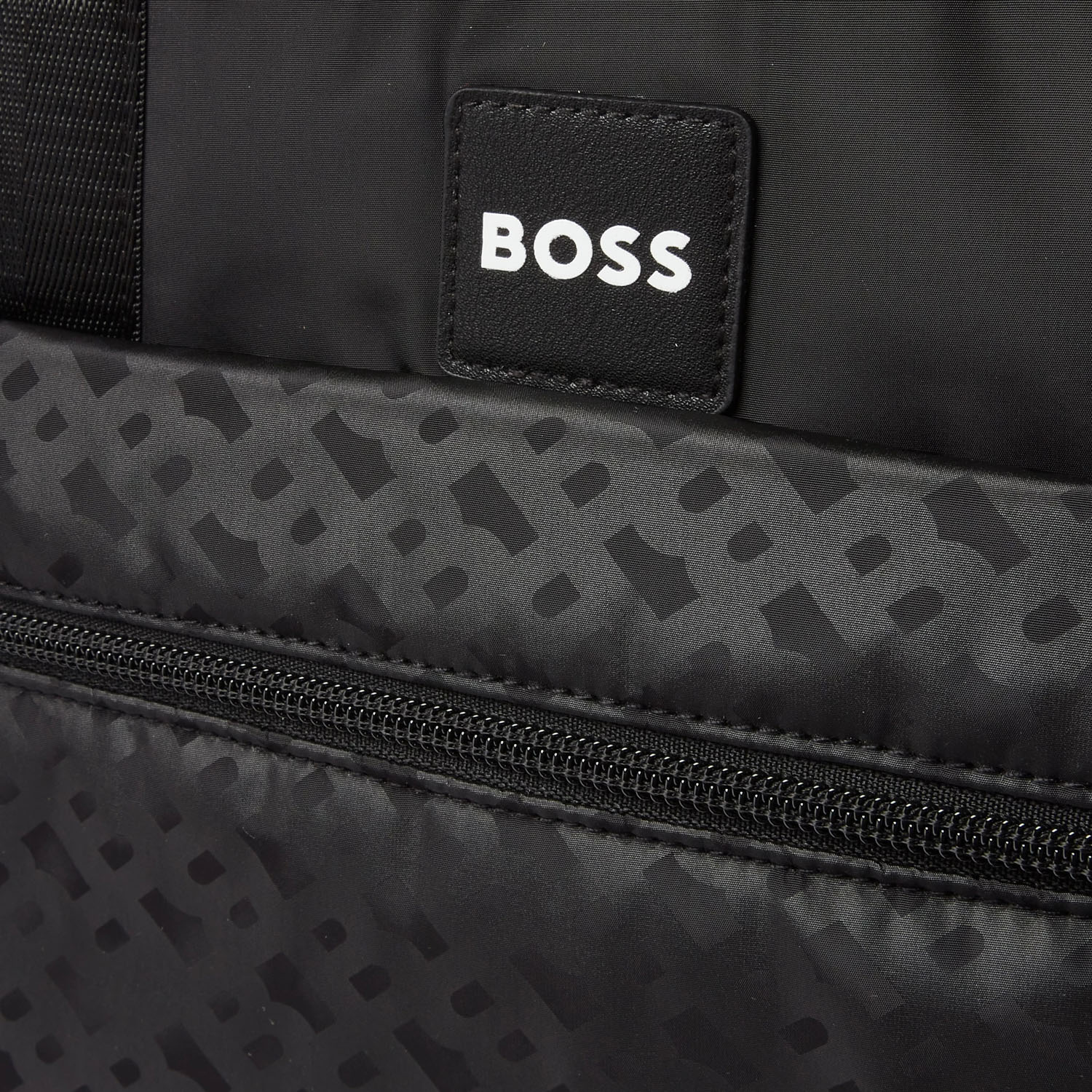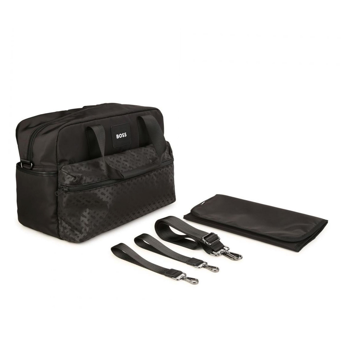 Hugo Boss black nylon changing bag with tone-to-tone monogram logos printed. It features zip fastening, shoulder strap and handles with ecoleather details. Inside has plenty of room with separate cases and comes with changing sheet-shelter, while at the bottom features ecoleather and metallic pins.