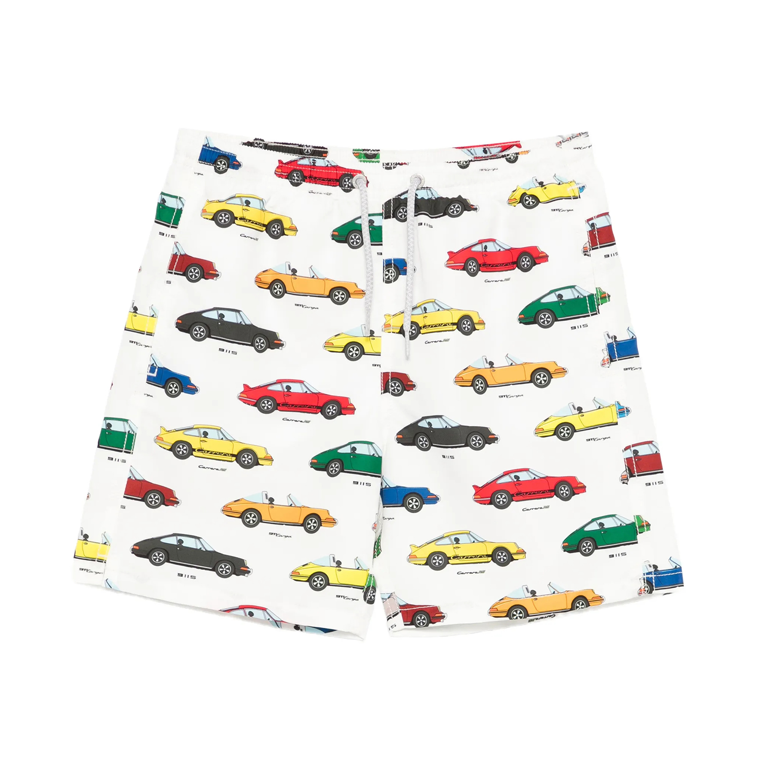 MC2 Saint Barth off-white swimshorts featuting colorful Porsche Carreras printed.
