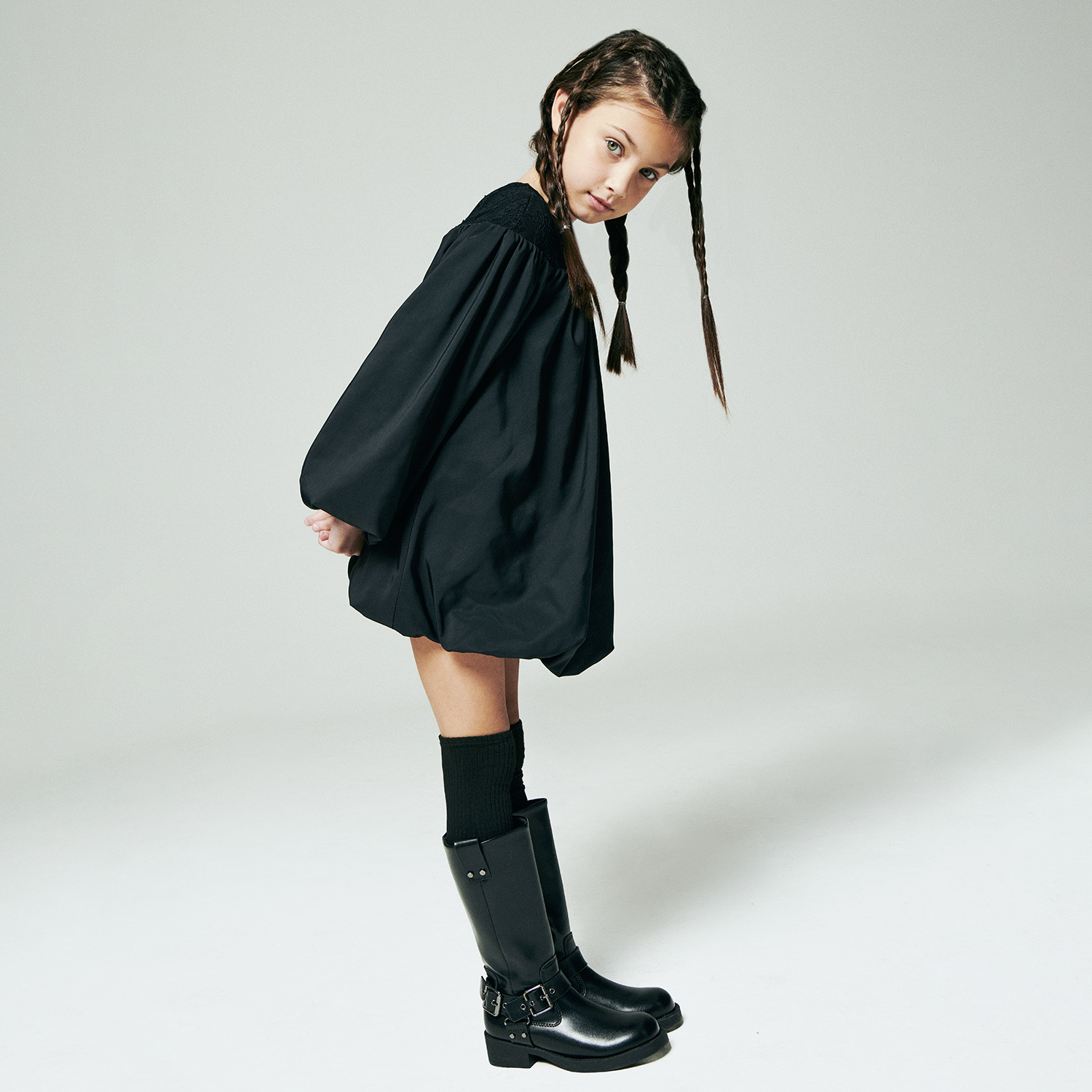 Pinko black soft taffeta dress with balloon-oversized style on the sleeves and on the waist. Around the neck feature a tone-to-tone lace part and button fastening on the back.