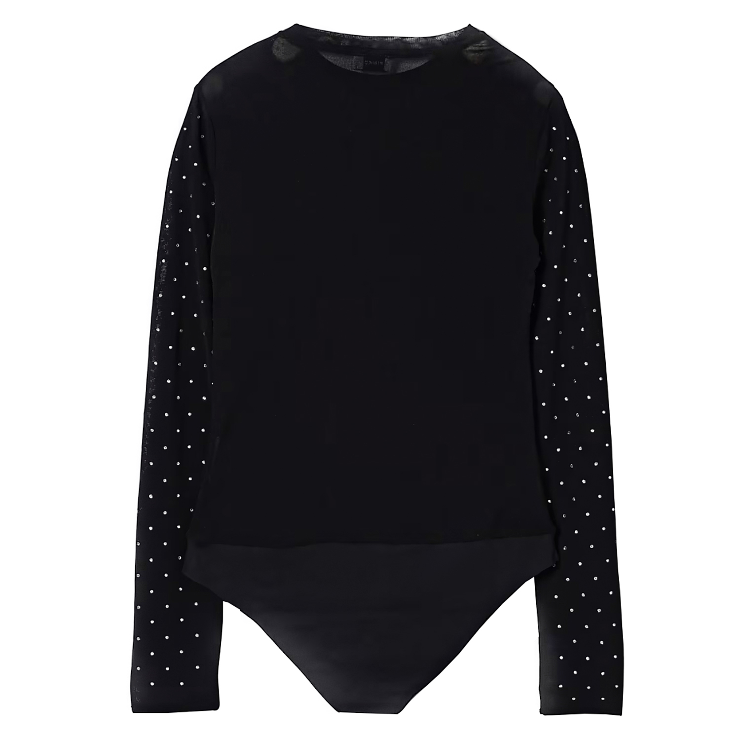 Pinko black tulle all-in-one (body) featuring all-over rhinestone applications and a soft lower part with snap button fastening.