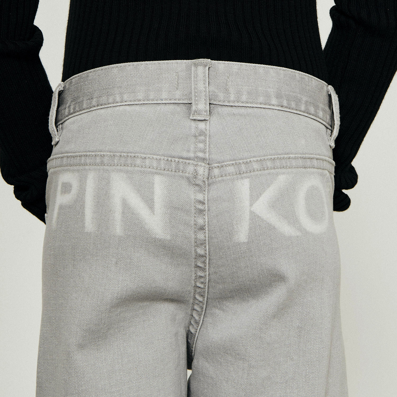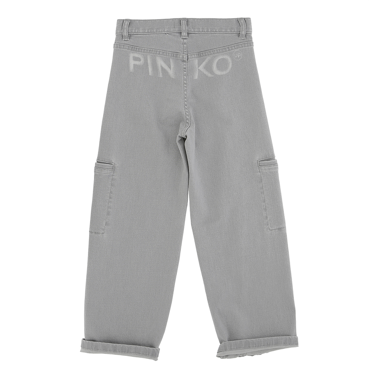 Pinko denim grey trousers, with very soft cotton fabric, elastic adjusters inside the waist and side pockets. On the back has a faded logo.