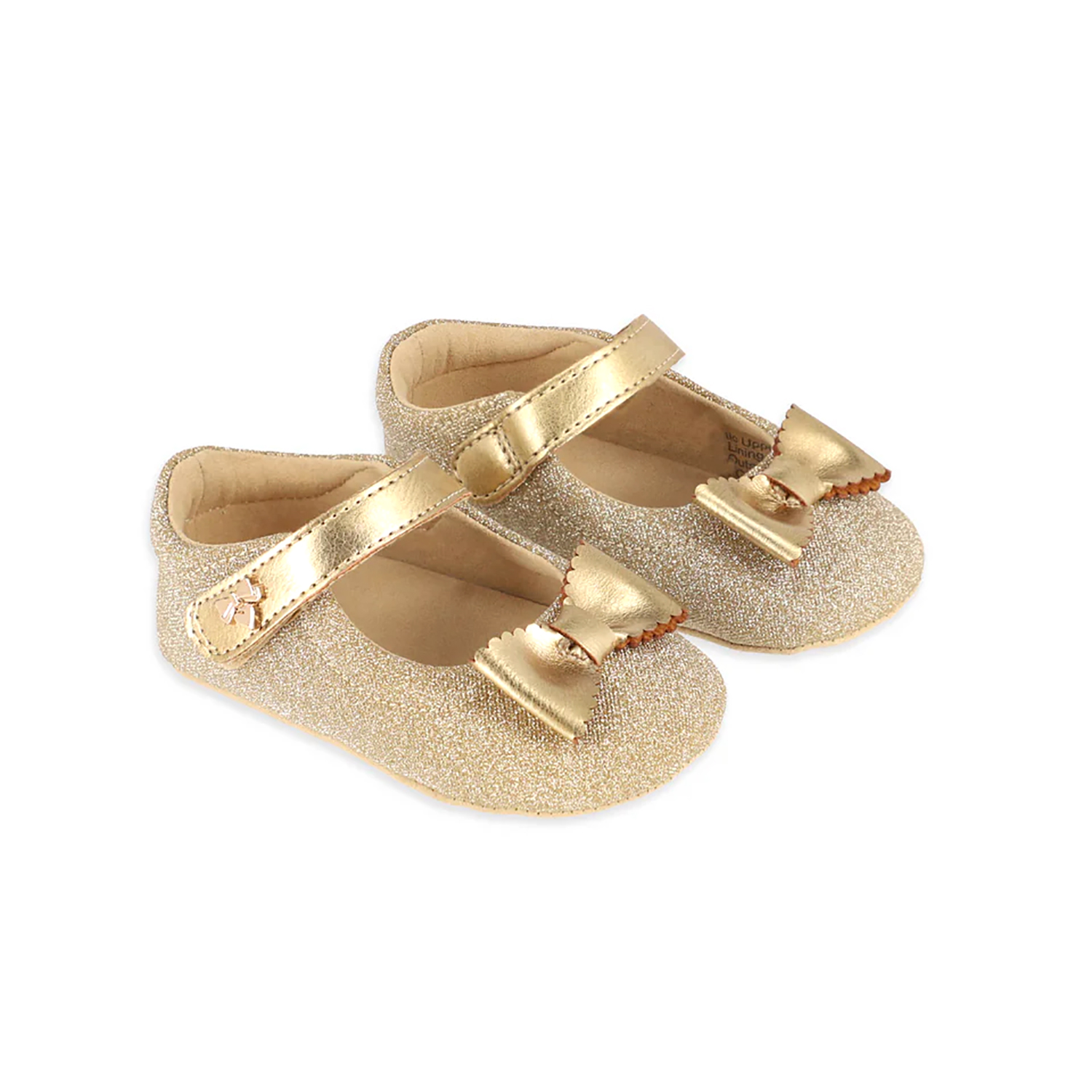Angel s Face lurex gold ecoleather ballerina shoes, featuring bow application and velcro tape fastening.