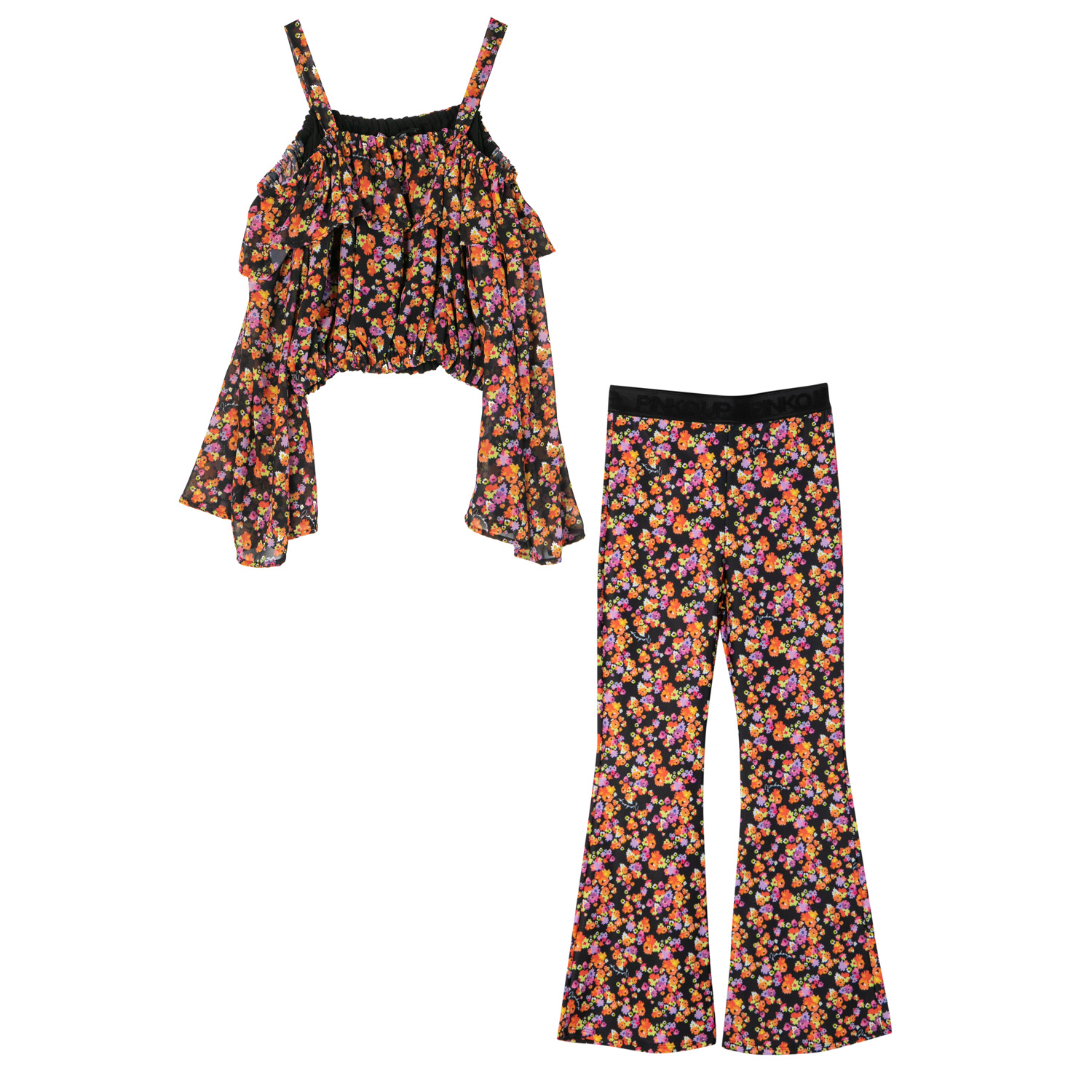 Pinko black-floral viscose set of a top and trousers. The top is elasticated with balloon sleeves and straps, while the trousers are very elastic, have A-line shape legs and logo elastic waistband.