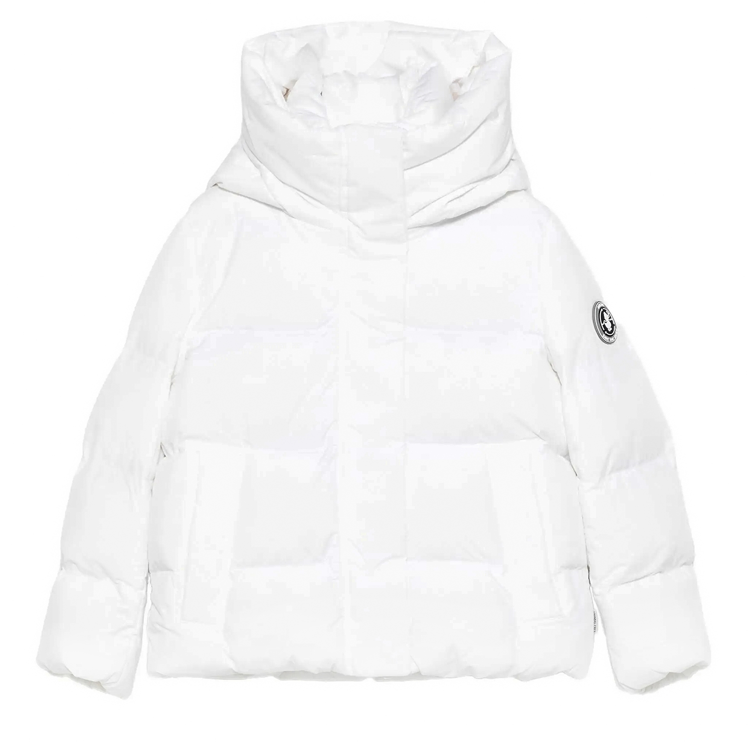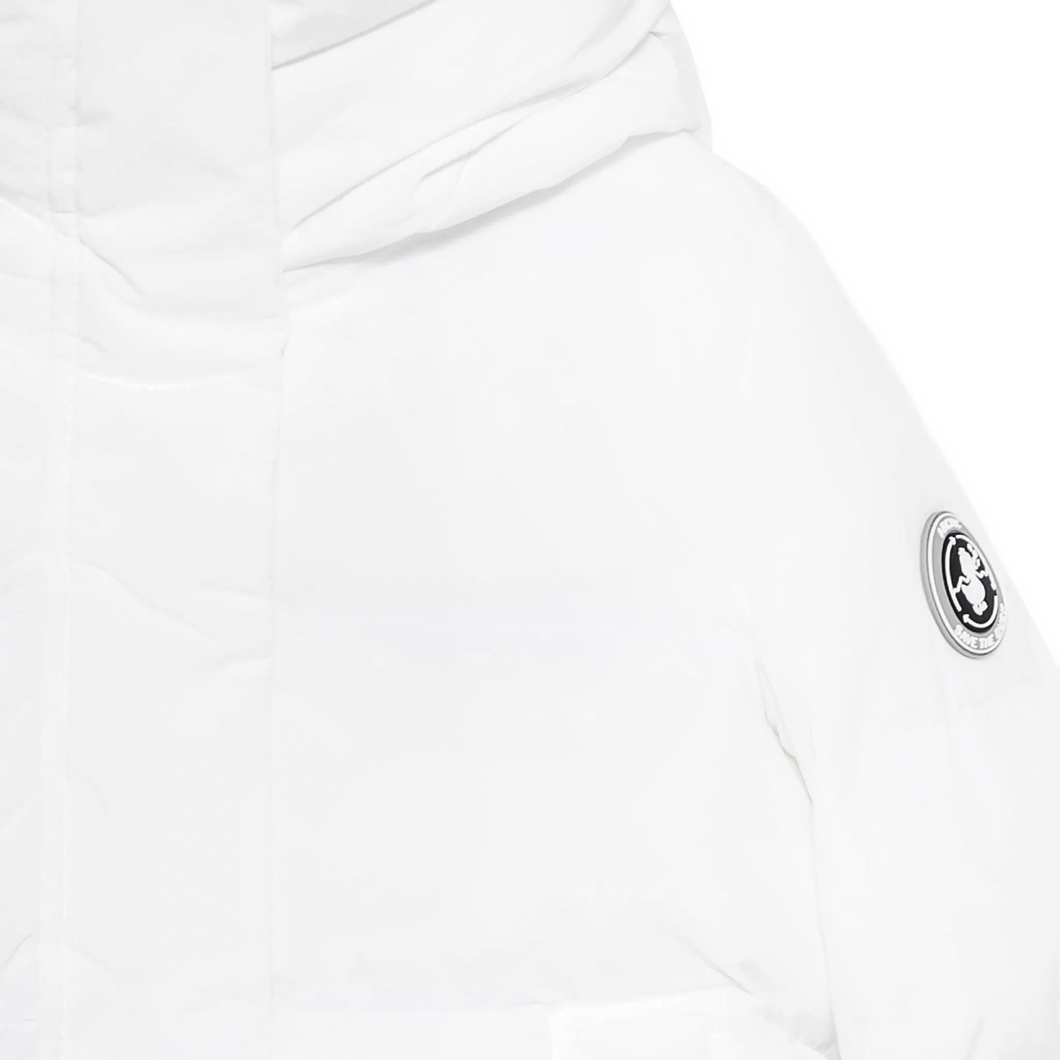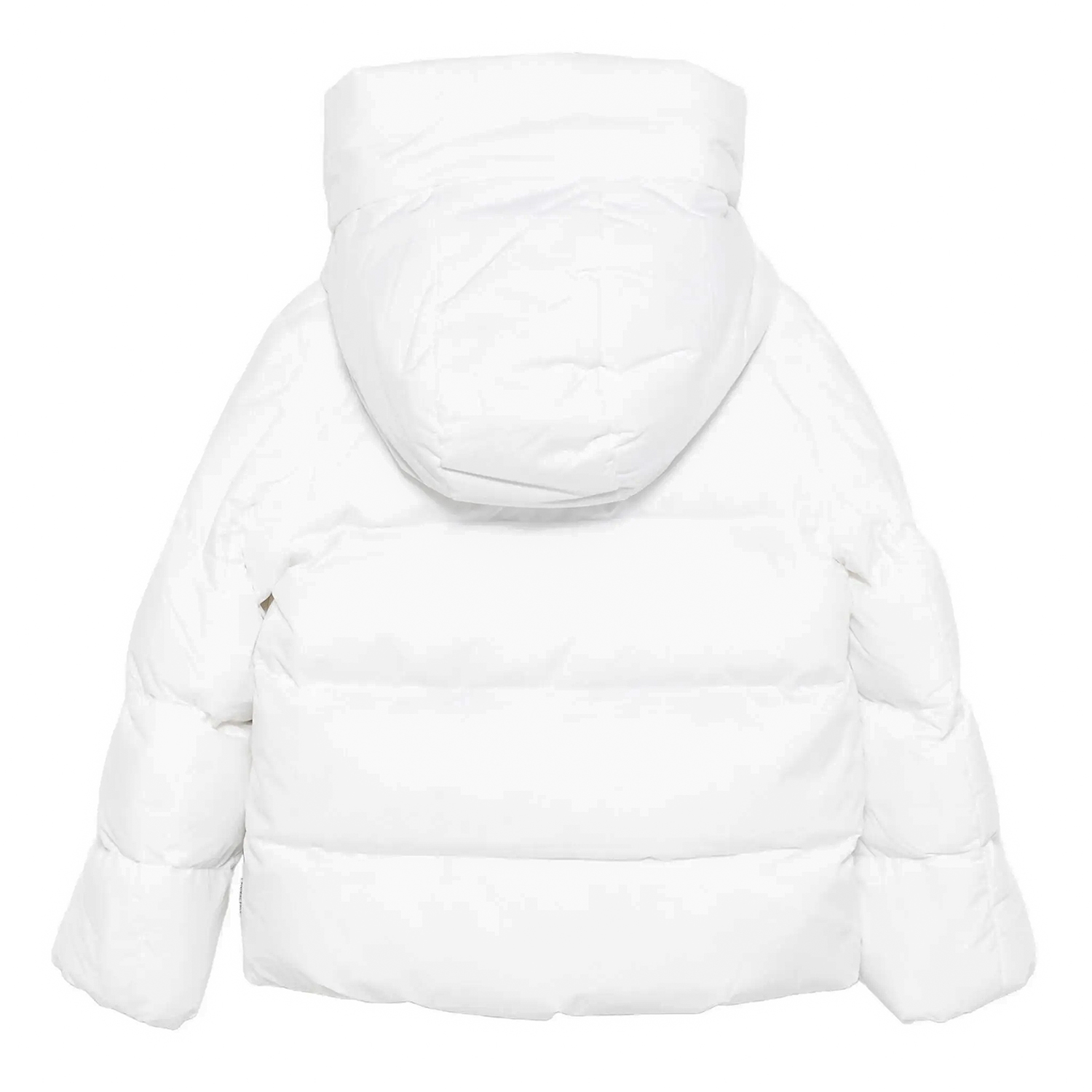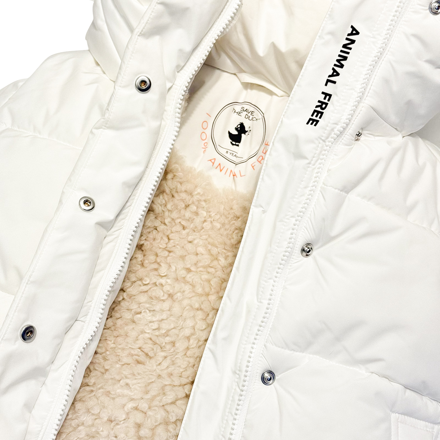 Save the Duck animal free, eco-friendly white padded jacket form the “Arctic-collection” with matte coating outside and inner boucle fur. It features concealed fastening, an attached hood with fur and pockets. It is very warm and for extreme cold circumstances.