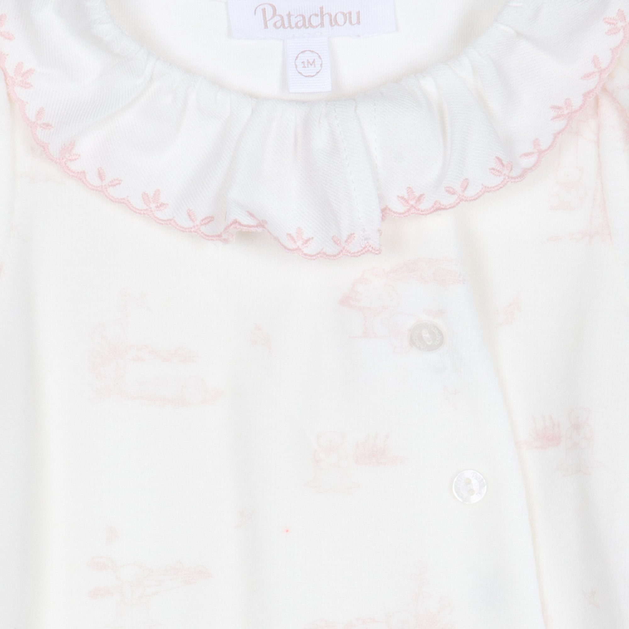 Patachou white organic cotton velour bodysuit featuring pale pink printed details, ruffle detailed collar and front button fastening.