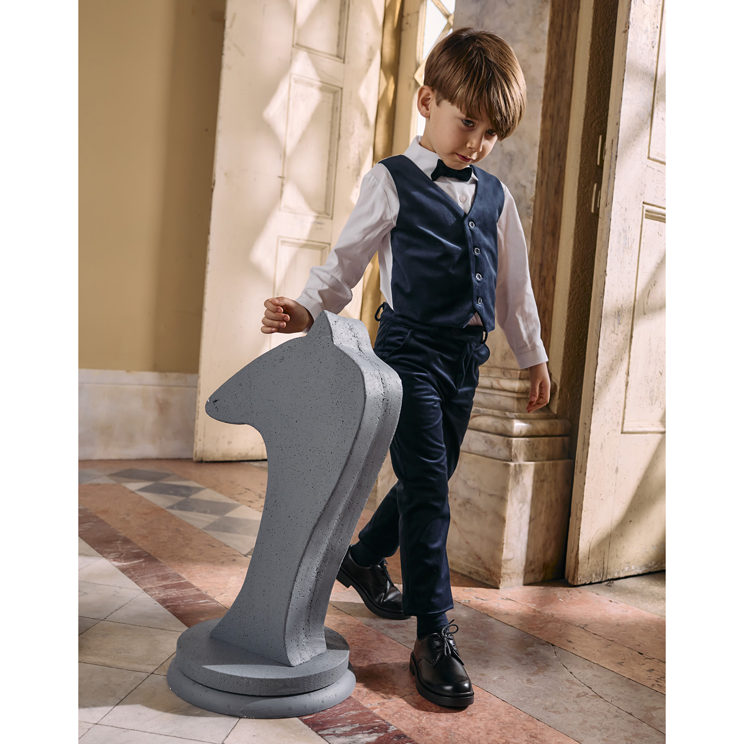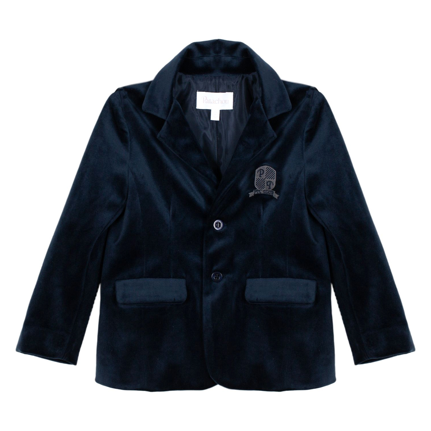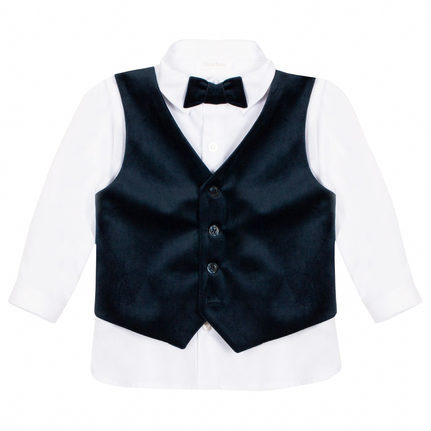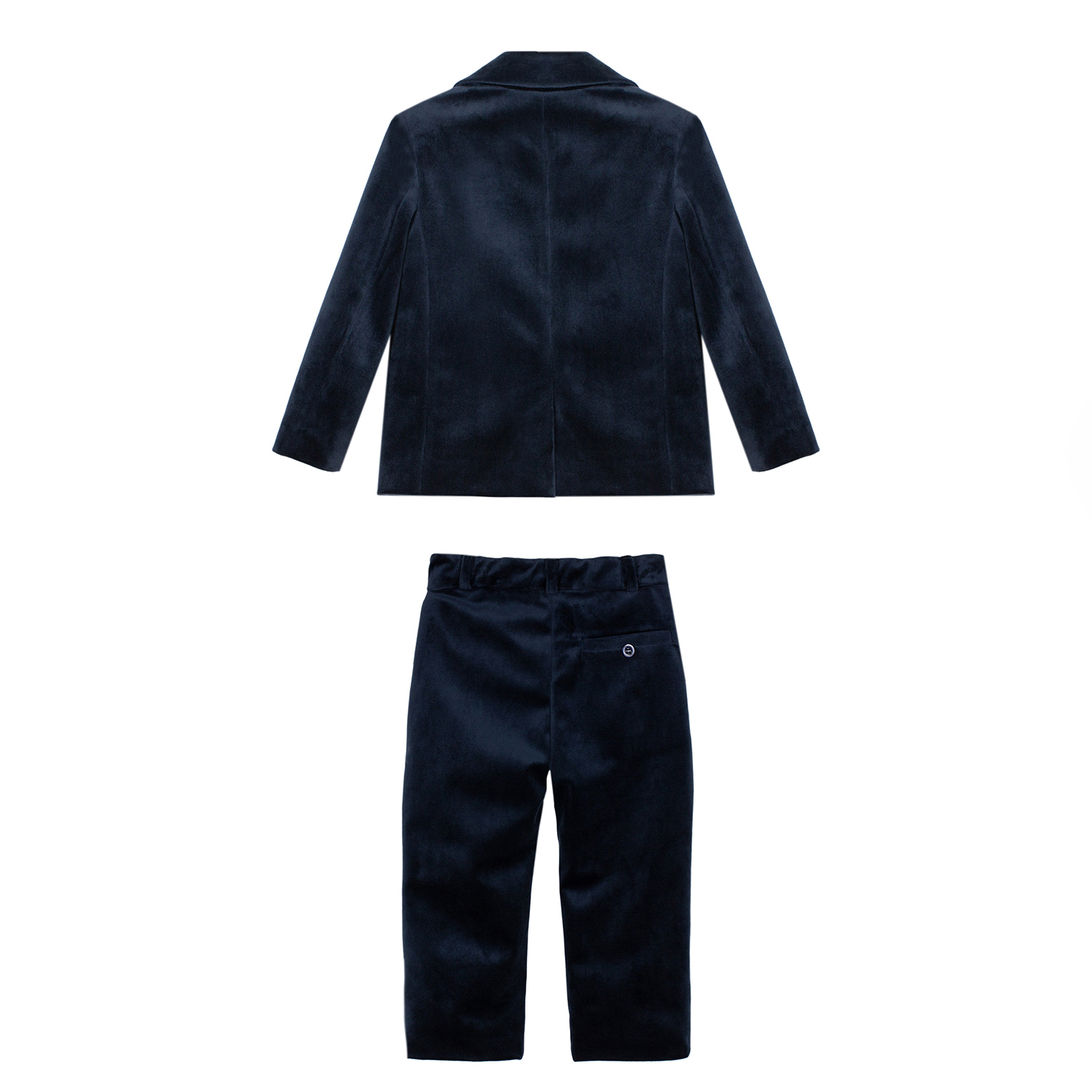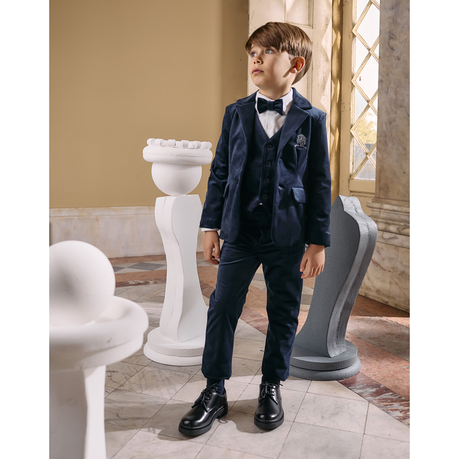 Patachou navy blue velvet formal suit set. It features a blazer, trousers, vest and a white cotton shirt along with a removable matching bow-tie.
