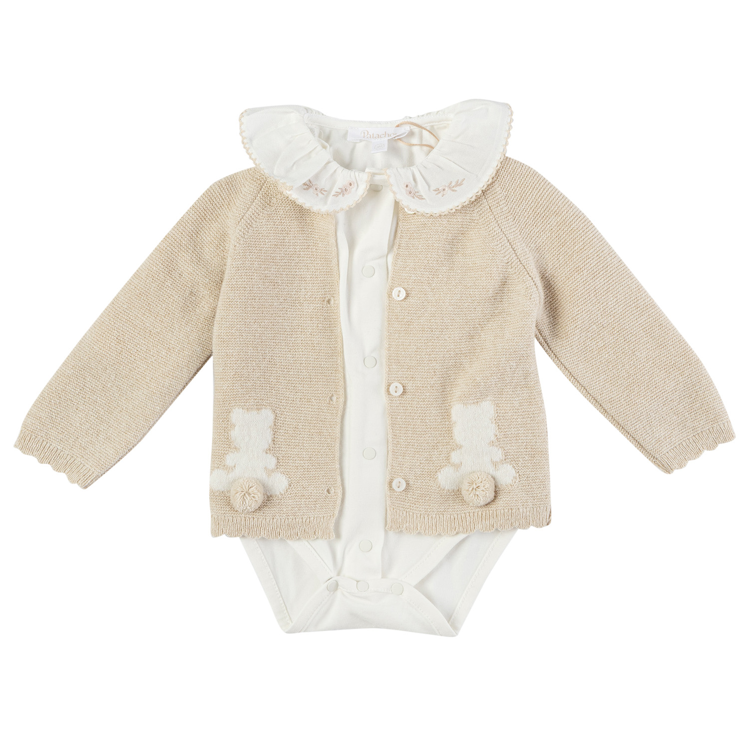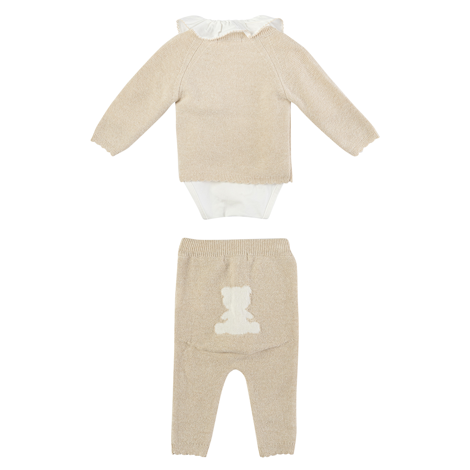 Patachou light beige knitted set of a cardigan and pants made of viscose, Merino Wool and cashmere blend. The cardigan features pom-pom details, teddy figures and wavy details, while the trousers have the matching teddy figure. It comes with a matching bodysuit featuring prints.