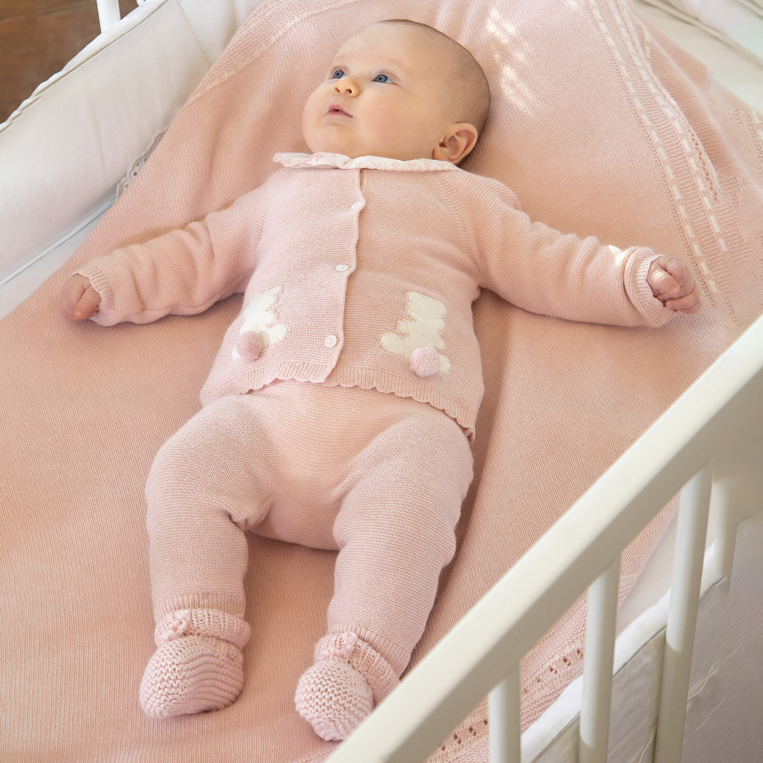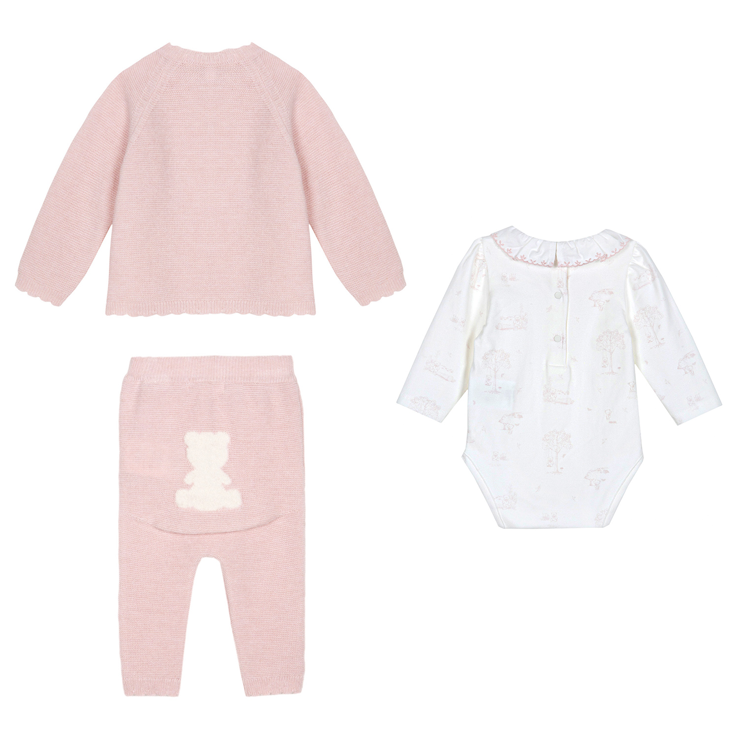 Patachou light pink knitted set of a cardigan and pants made of viscose, Merino Wool and cashmere blend. The cardigan features pom-pom details, teddy figures and wavy details, while the trousers have the matching teddy figure. It comes with a matching bodysuit featuring prints.