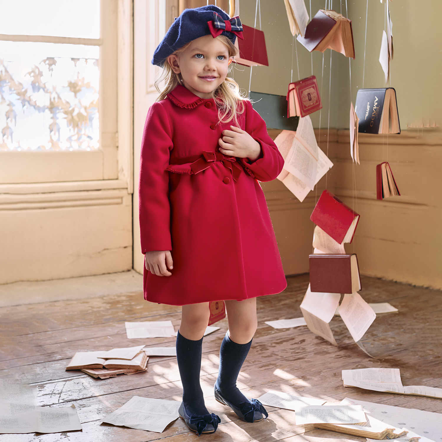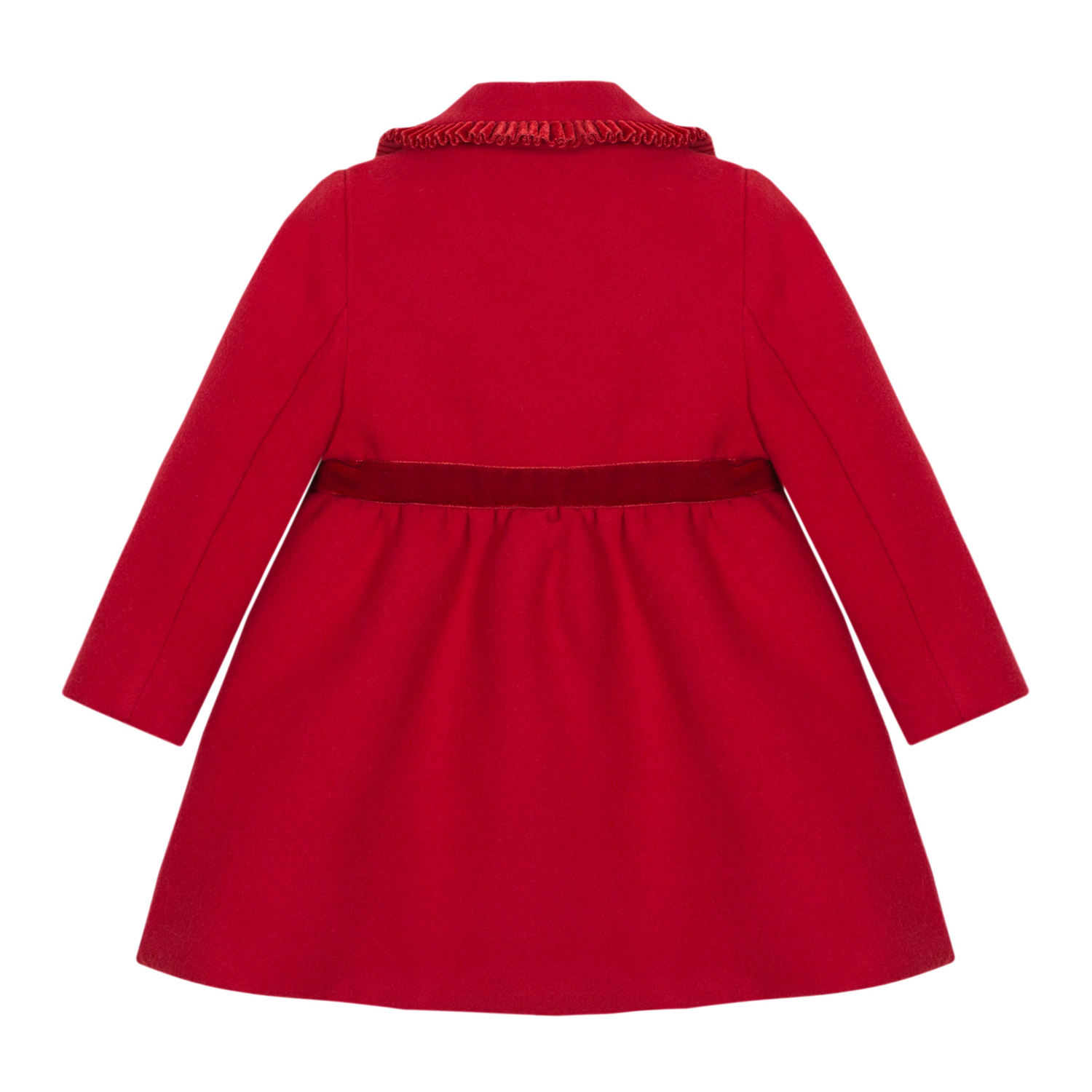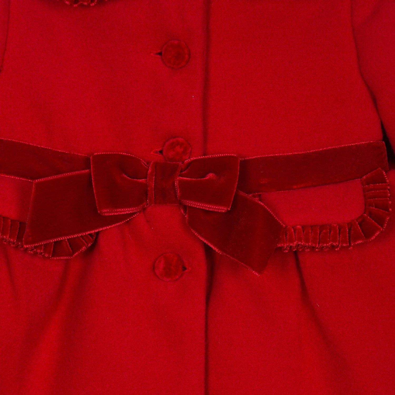 Patachou red techno wool coat with pleated details and velour details on the collar and bow applications on the waist.